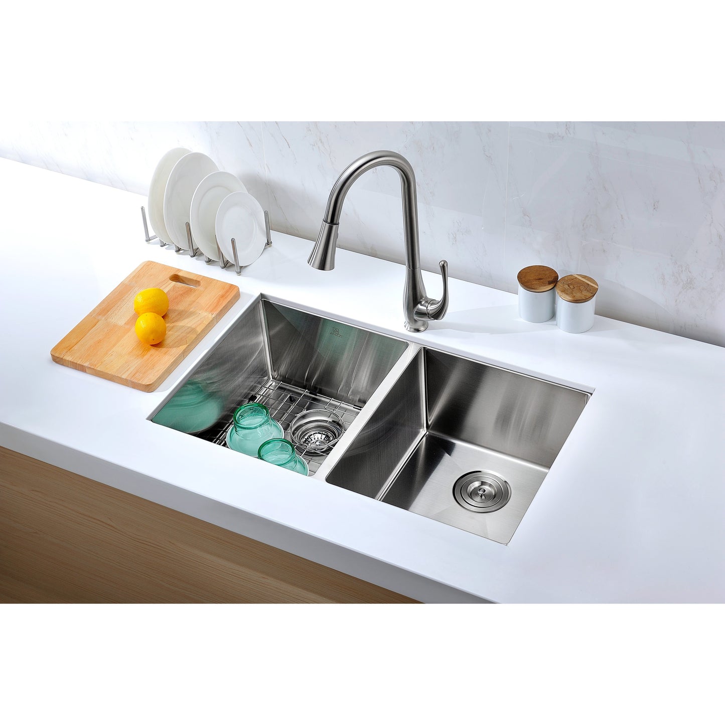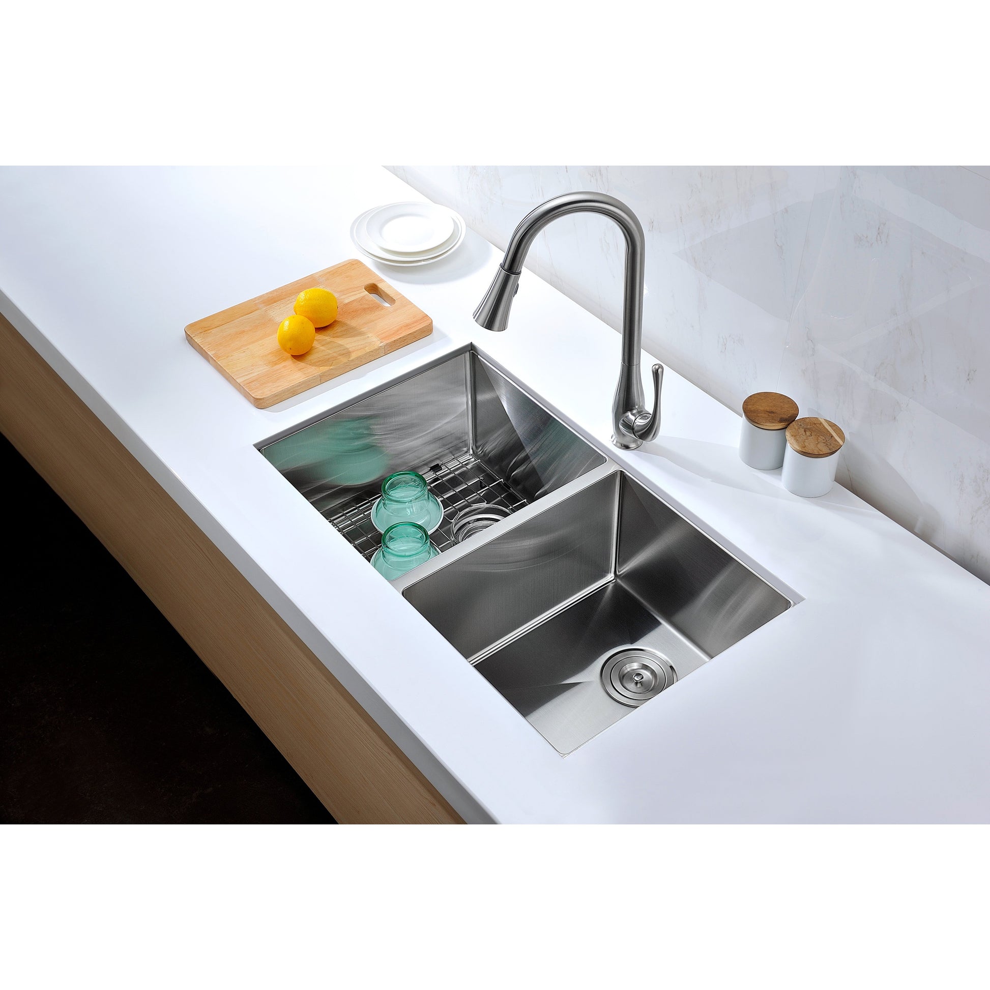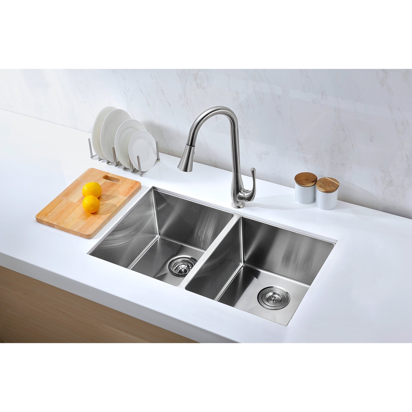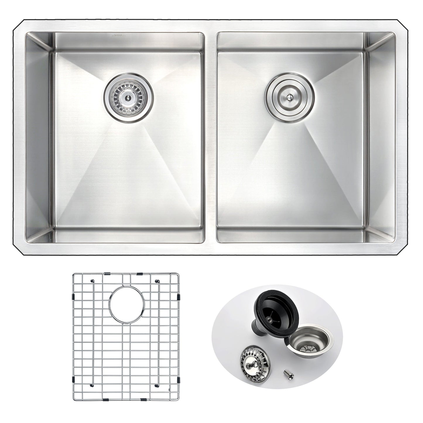 ANZZI Vanguard Series 32" Double Bowl 50/50 Stainless Steel Undermount Kitchen Sink With Strainer and Drain Assembly