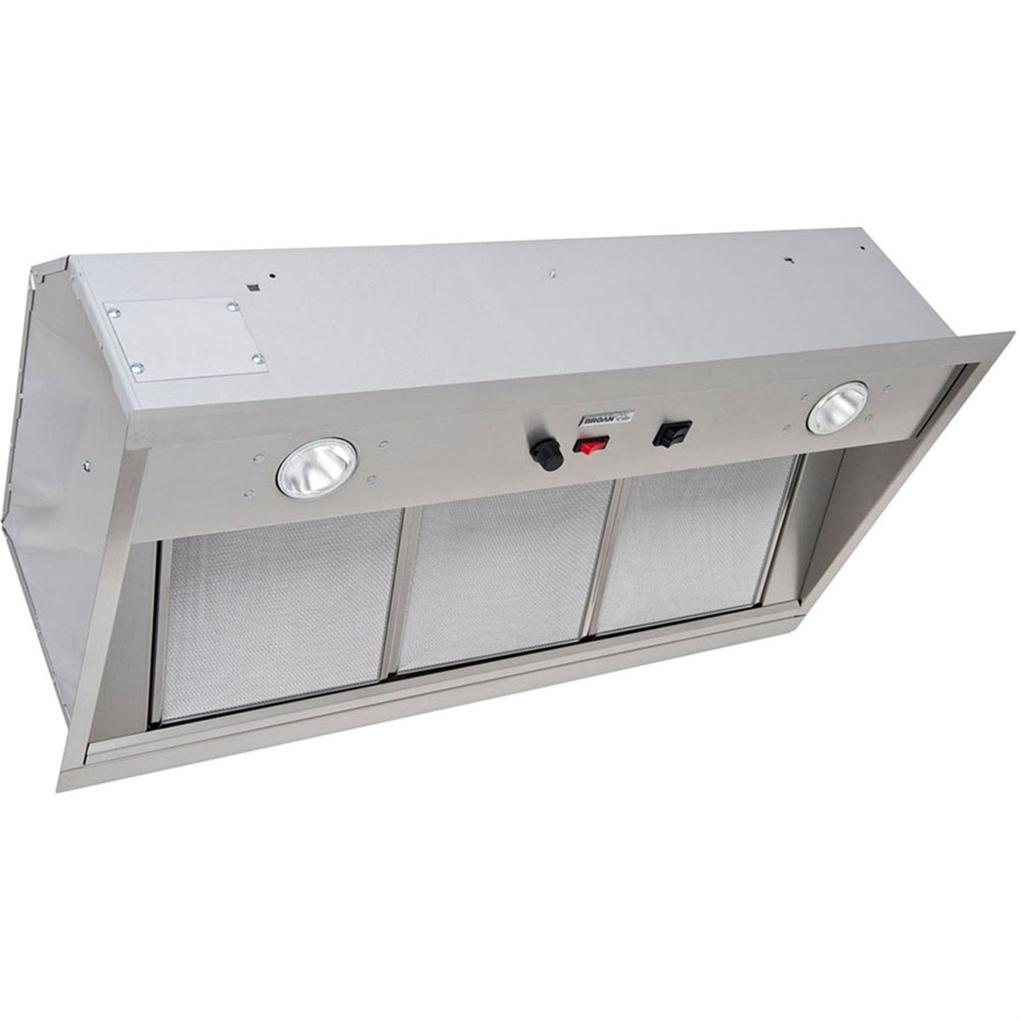 The Broan RMIP33 33-inch Pro-Style Insert fits flush with the bottom of the cabinet or custom hoods. Centrifugal blowers from 500 to 1500 CFM with multi-speed control to provide quiet and effective performance. Halogen lighting complements the beauty of its fully-enclosed, easy to clean bottom. Blower sold separately.