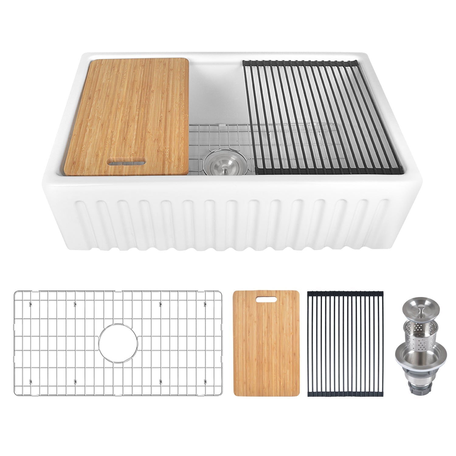 DeerValley 33" Single Bowl Rectangular White Easy-Cleaning Farmhouse Kitchen Sink With Basket Strainer, Basin Rack/Bottom Grid, Cutting Board and Colander