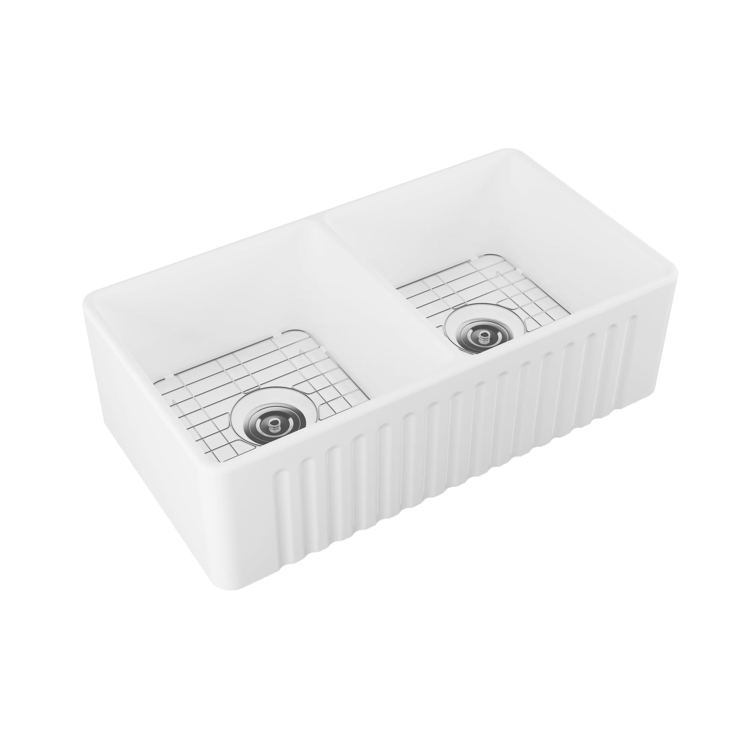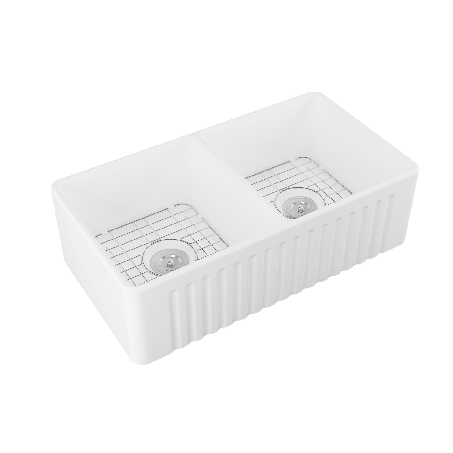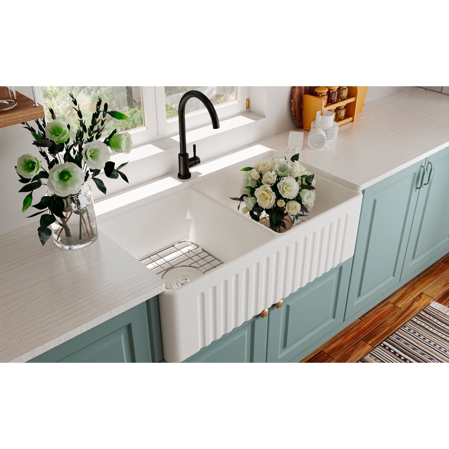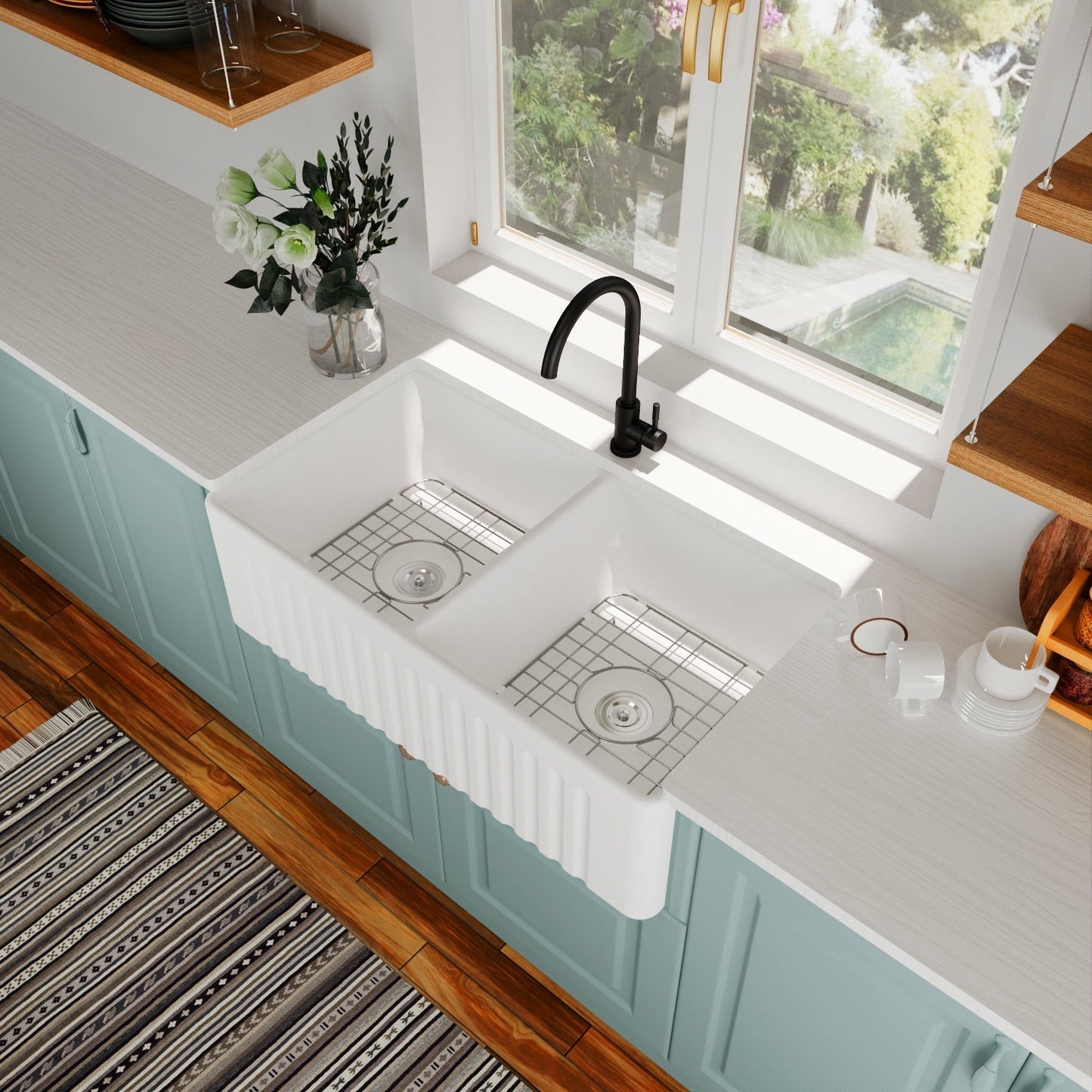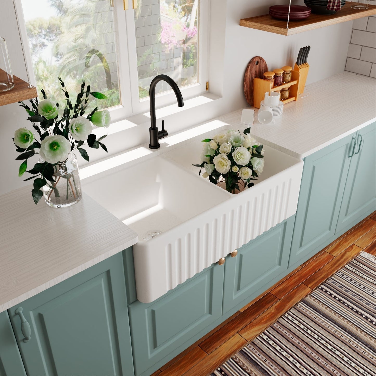 Bring a touch of country-chic style to your kitchen with this lovely dual basin kitchen sink, perfect for rinsing dishes and filling stockpots. Dual basin for tasks of any size. A versatile sink made from high-quality ceramic that’s extremely resistant to scratches and stains, and will not fade over time. A farmhouse apron sink is a traditional design that has withstood the test of time. While it continues to be on-trend, it offers the traditional features which will help you with all your day to day tasks! The 2 basin design let you run your kitchen how you see fit – with an area for prep and washing, a separate bowl for drying or rinsing. Ergonomically friendly design means there is no counter between you and the bowls, so there is no leaning over during tasks.