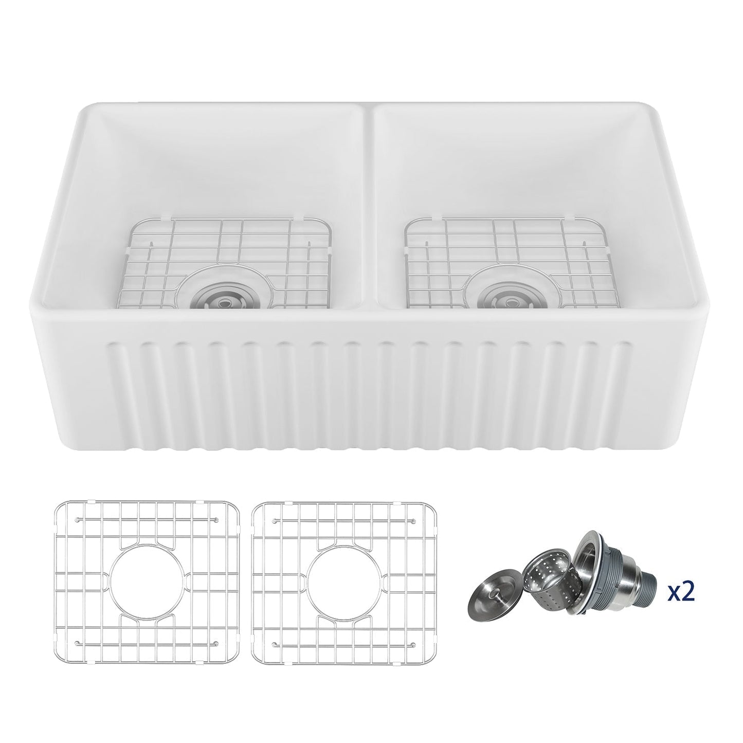 DeerValley Eclipse 33" Double Bowl Rectangular White Ceramic Reversible Farmhouse Kitchen Sink With Basket Strainer Drain and Grid