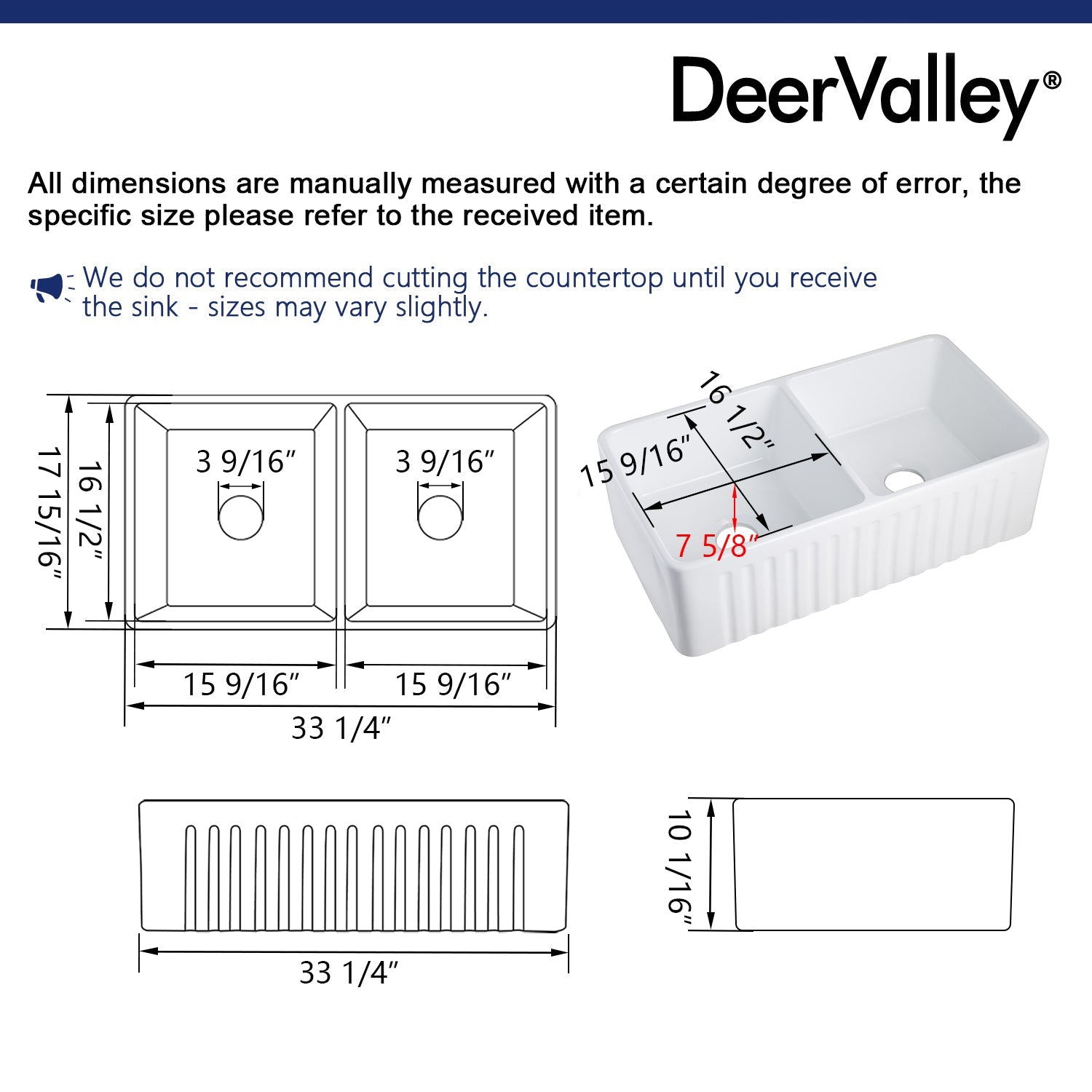 DeerValley Eclipse 33" Double Bowl Rectangular White Ceramic Reversible Farmhouse Kitchen Sink With Basket Strainer Drain and Grid