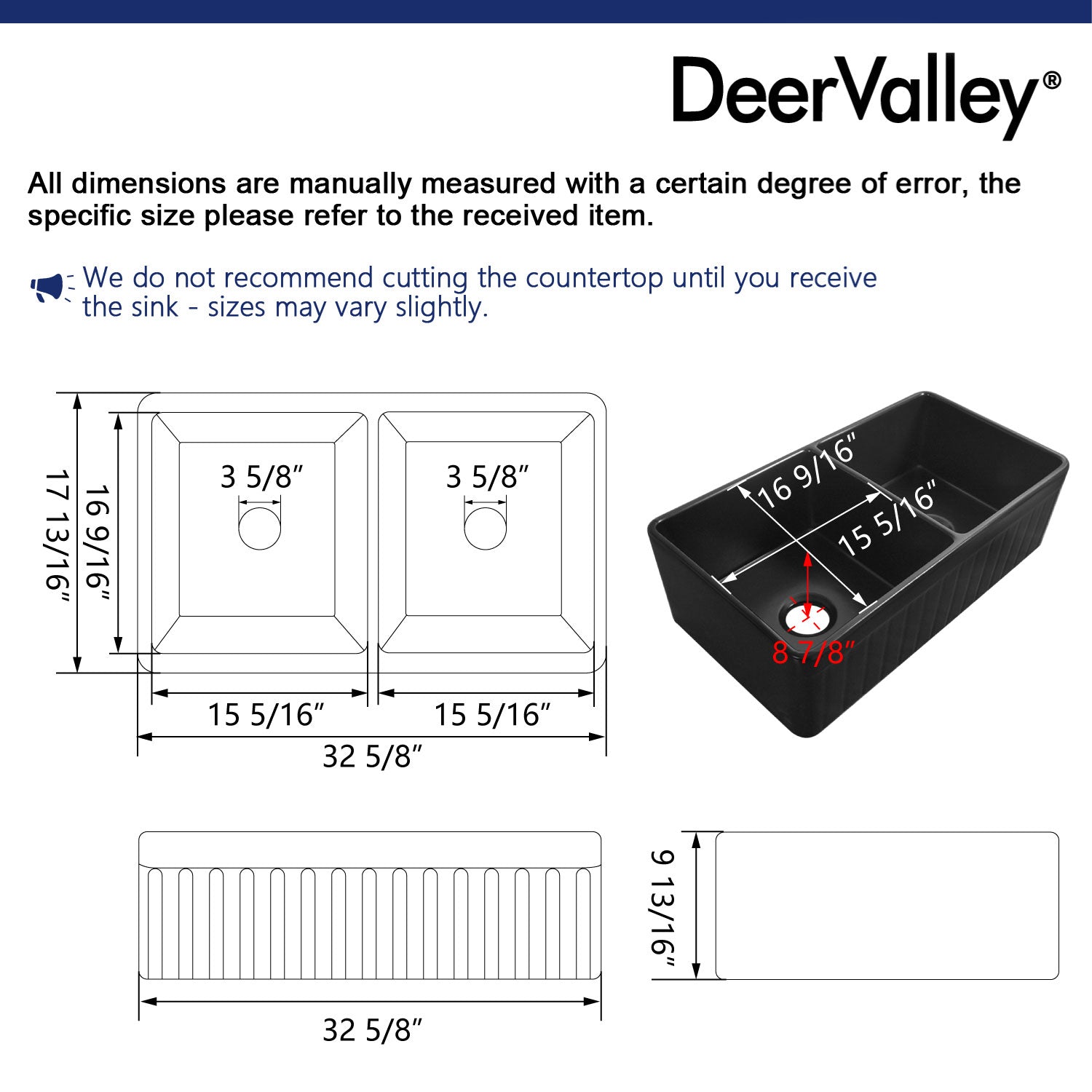 DeerValley products are made with quality materials and excellent craftsmanship to provide the customers a long-lasting product. in the case of any defects in materials or craftsmanship under regular use were inspected in the first one year of delivery, DeerValley will provide replacement parts at no charge, or at its option, replace any product or part of the product that is deemed defective, under normal installation, use, service, and maintenance. This warranty applies only to the original purchaser. Proof of purchase will be required in the case of a claim. SCRATCHES ARE NOT COVERED UNDER WARRANTY.