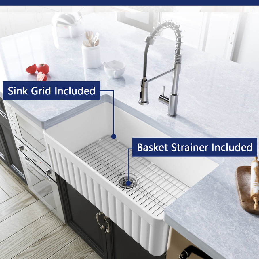 This beautifully designed farmhouse sink instantly elevates any kitchen. Its smooth, high-gloss apron front serves as an elegant centerpiece for the entire kitchen. Durable fireclay construction with high temperature heat-treated vitreous glazed surface to resist stains and scratches. Fireclay farmhouse sink is hardened with a lasting, high gloss glaze that prevents scratches and stains. The unique design makes this sink suitable for use on any standard countertop material.