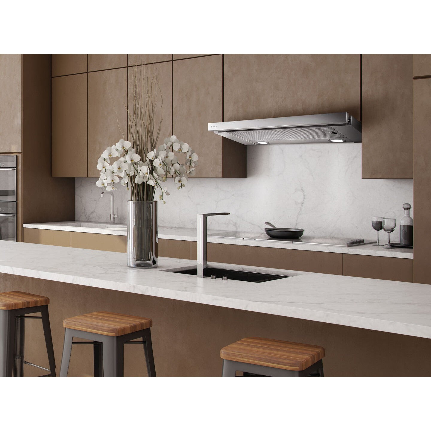 The ultra slim design of TT hides quietly within cabinetry and extends less than 2” below the edge. When called to action, the horizontal visor effortlessly pulls out to provide added air capture during cooking. TT design is ideal for smaller kitchens or where under-cabinet space is limited.The 400 CFM blower provides more than adequate power for everyday cooking. The 3 speed blower and LED lighting are operated with modern electronic touch controls, which are out of sight and behind the visor when idle.