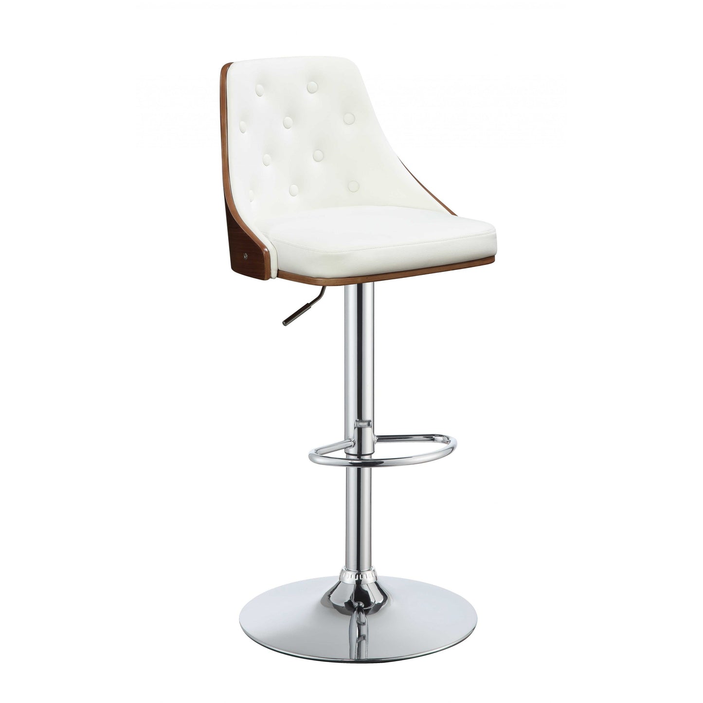 Create a modern and trendy look in your kitchen with this adjustable bar stool. This piece couples a walnut curved wood with cream-white faux leather to create an eloquent seat. The chrome featured on the base, pole, and footrest complements the seat perfectly to create a contemporary bar stool. Have a seat in luxurious comfort on this bar stool. The backrest provides ample support and promotes good posture while seated. A footrest allows an alternative to dangling legs. An adjustable seat that gives a perfect height for everyone, and the 360? swivel adds convenience and fun to the bar stool.