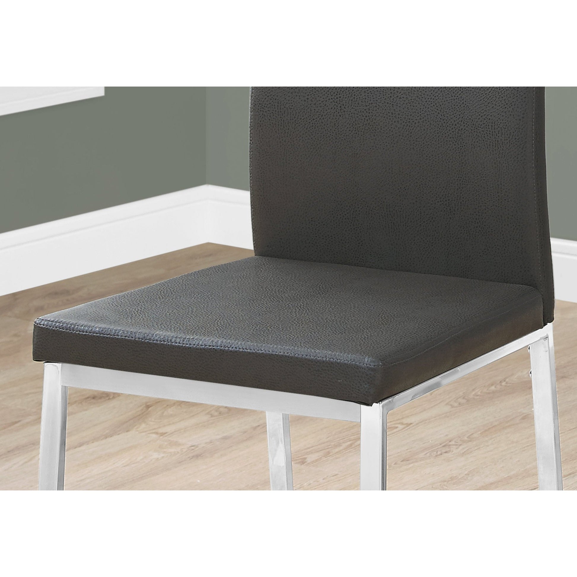Out with the old and in with the new, this set of two gray upholstered faux leather solid back dining chairs can perfectly suit any dining table. This armless chair has a sleek silhouette making it ideal for seating around the table but can also double as an accent chair. The solid back gives this chair its unique style. Multiple units can be stacked on top of one another for storing when not in use. Dining chairs are a great way to compliment your kitchen or dining room but can also be used in the foyer, hallway, or any room you might need extra seating. 38" H x 17" W x 20" D
