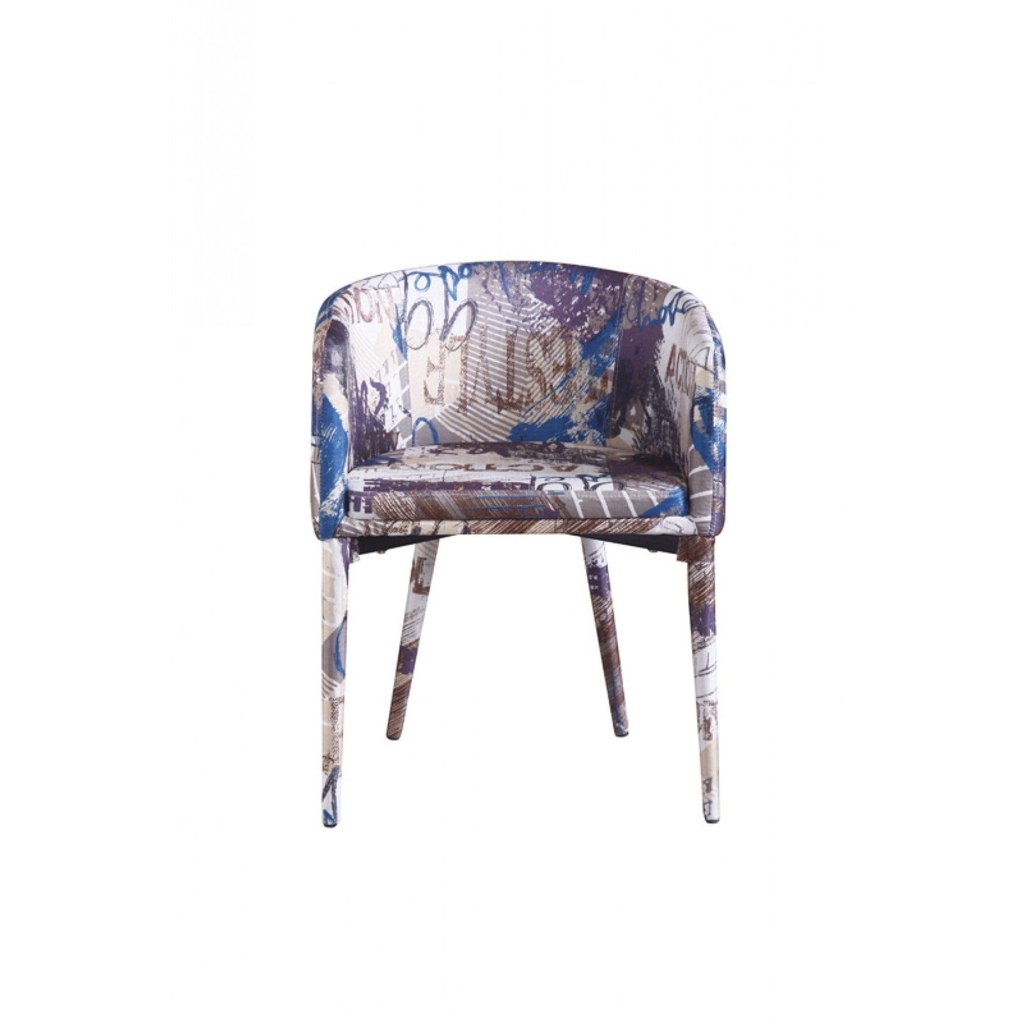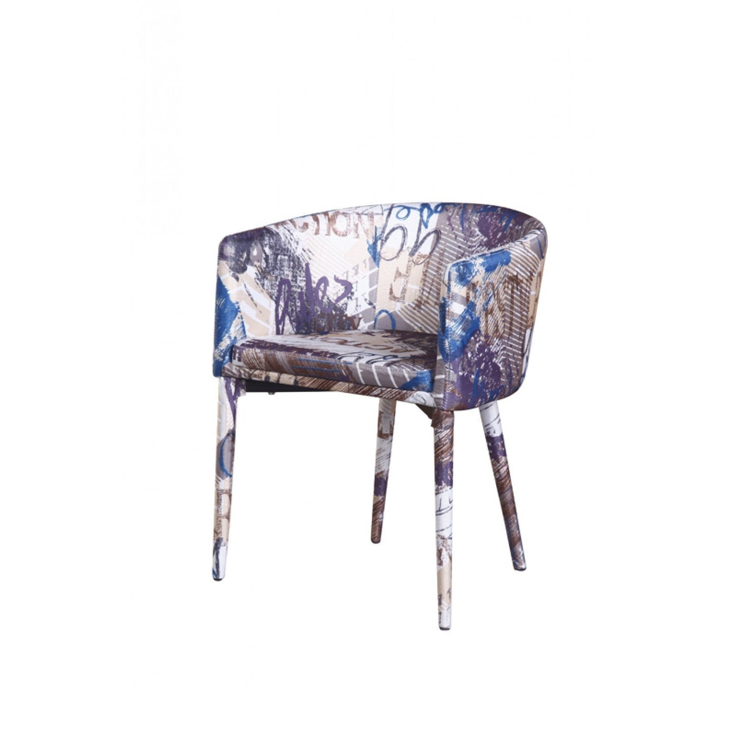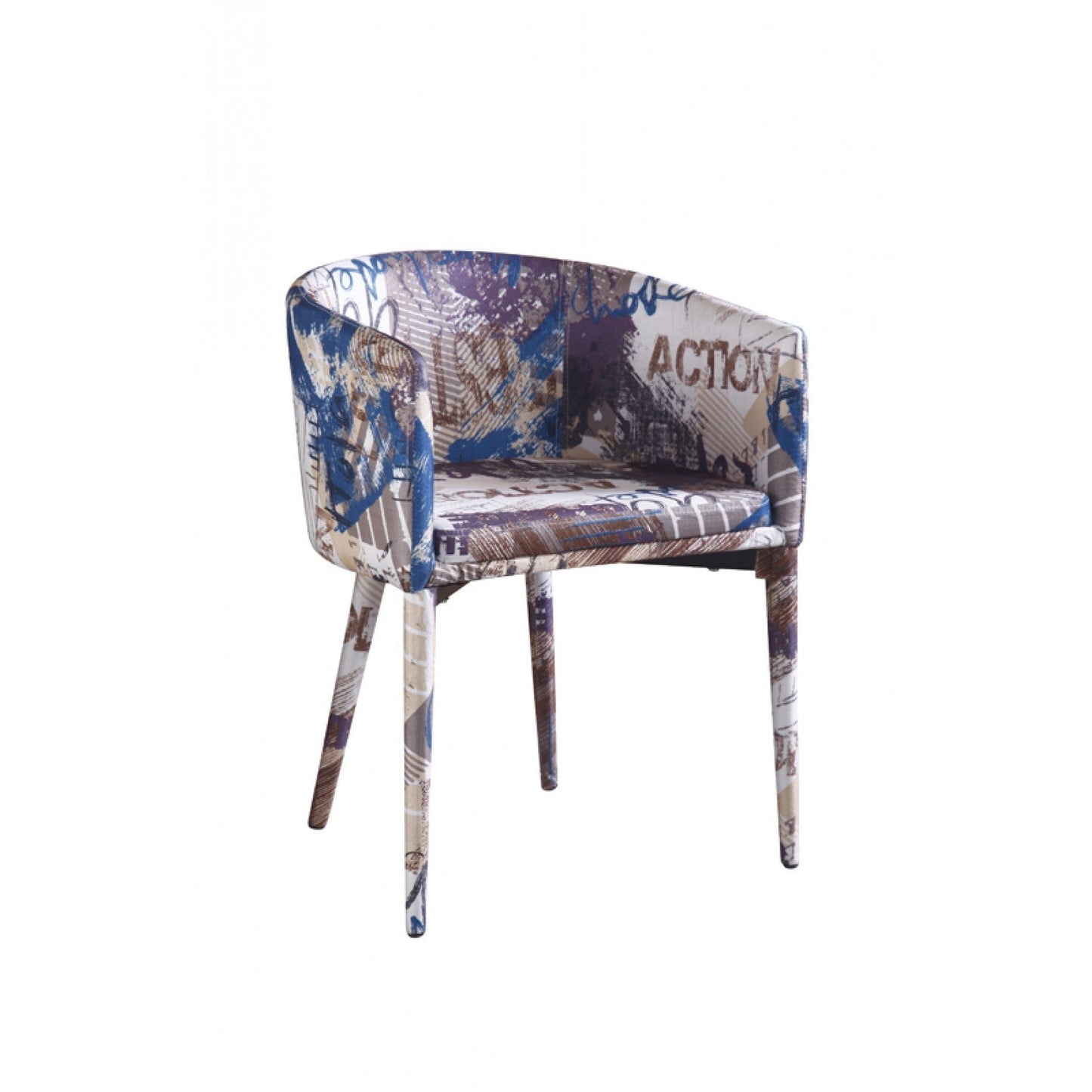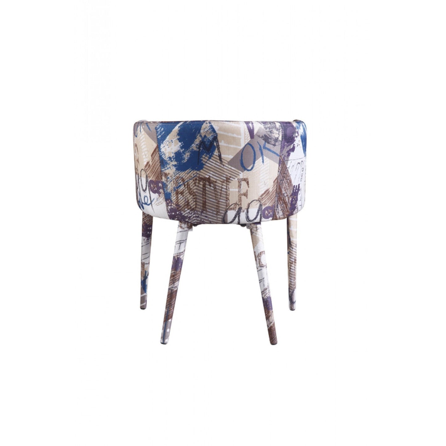 This fabric dining chair features a continuous back and arm design that seem to wrap you in comfort. Upholstered in multi-color patterned fabric, it stands on metal legs covered in the same fabric. Foot caps on the legs prevent your floor from getting scratched. With a dimension of W18" x D21" x H28" and a seat height of 19".