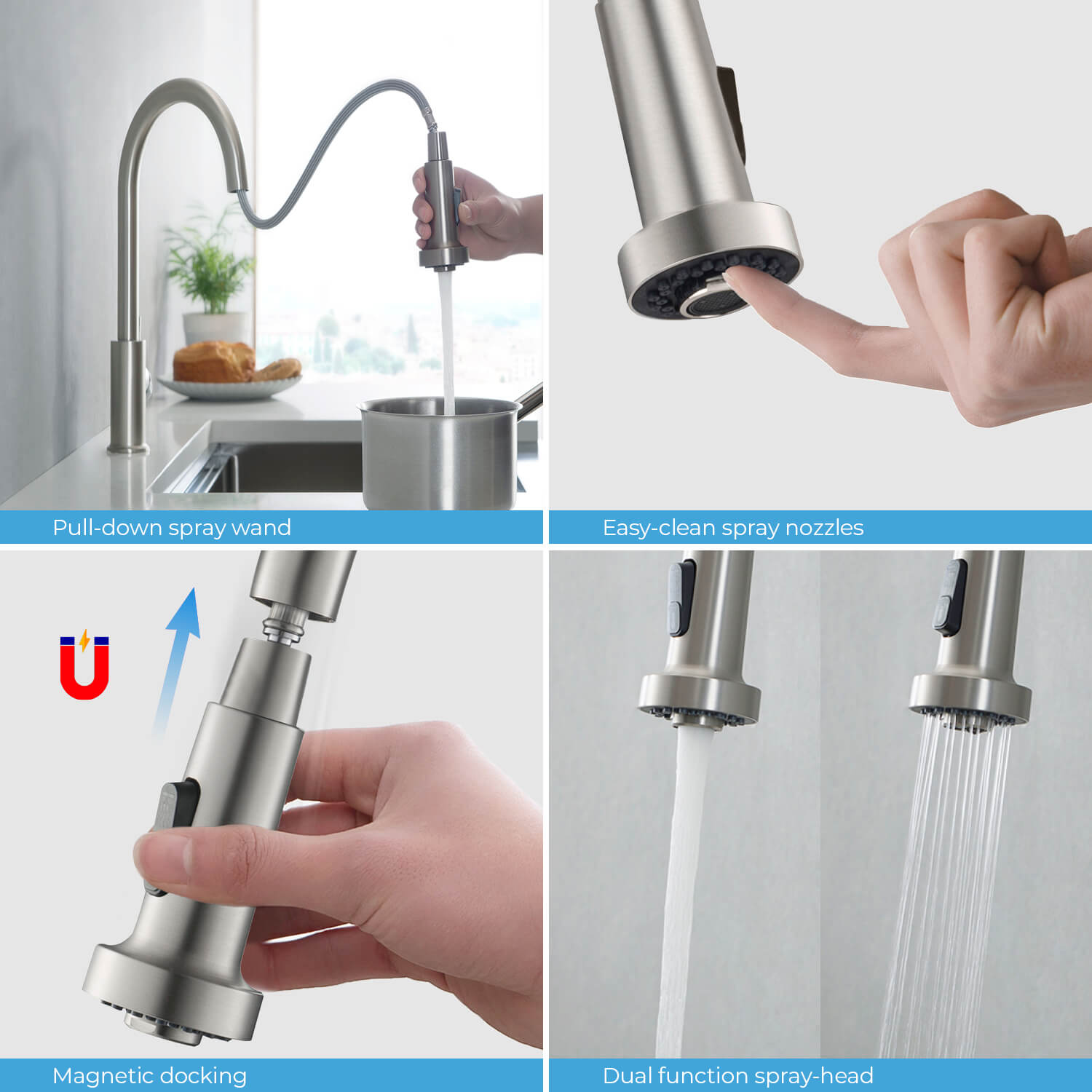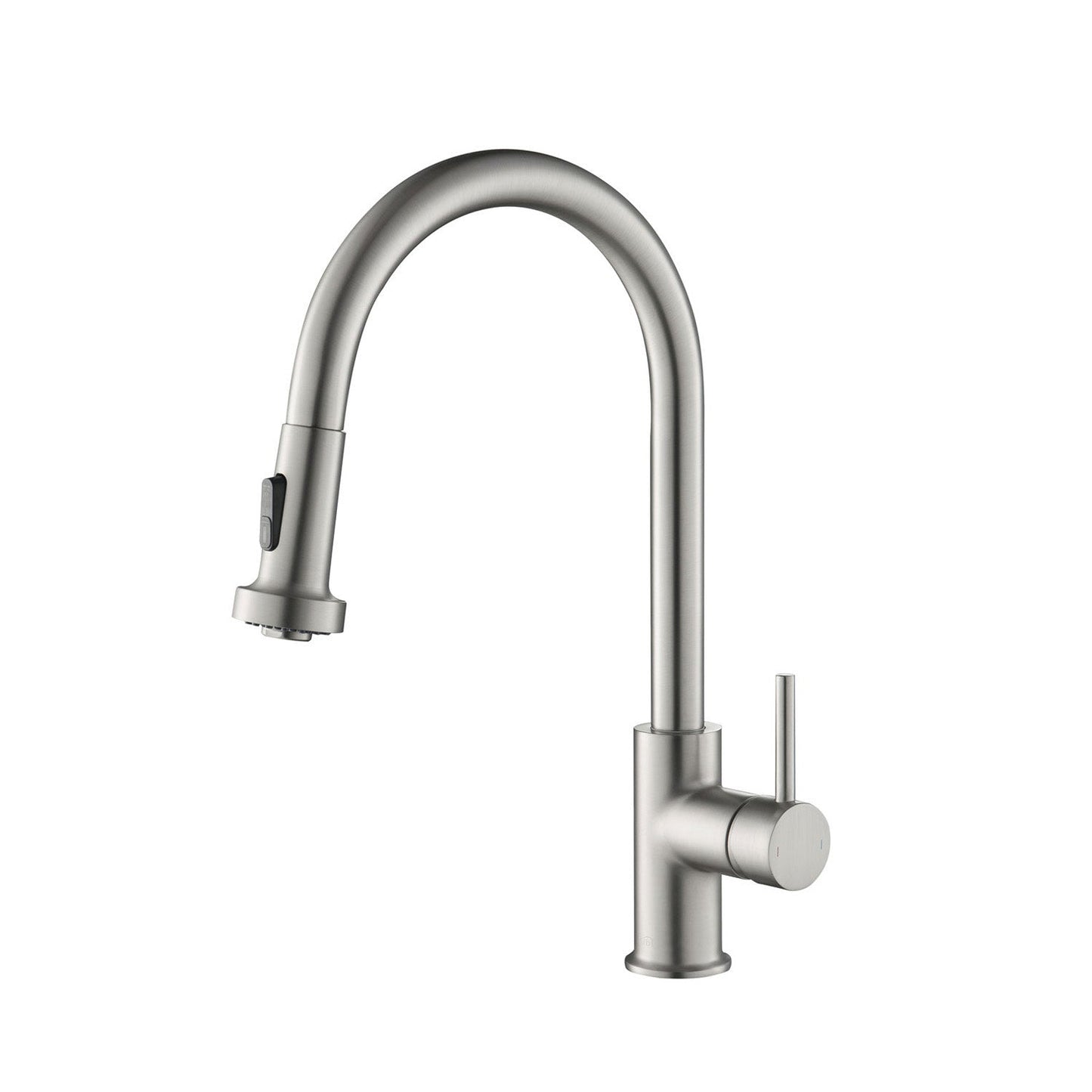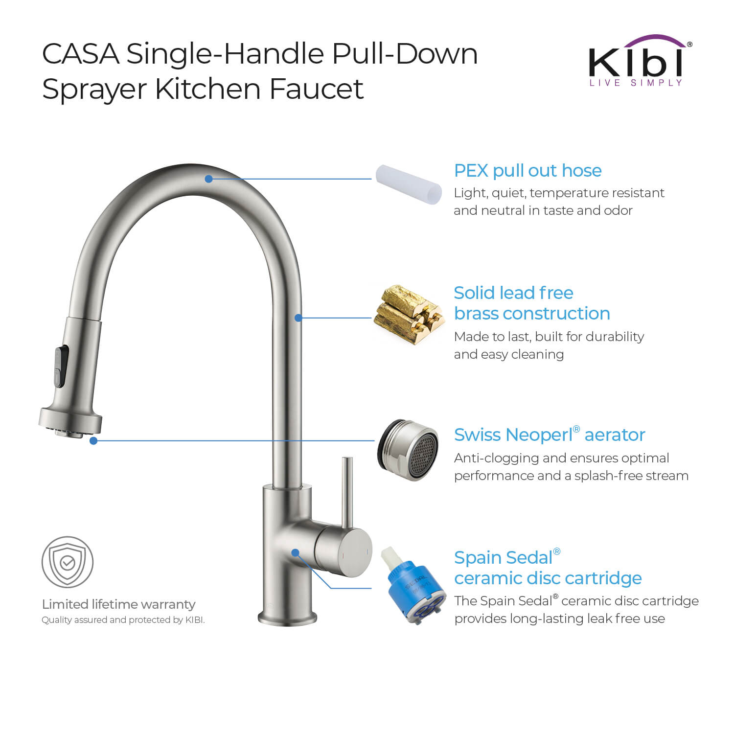 Kibi Casa Single Handle High Arc Pull Down Kitchen Faucet in Brushed Nickel Finish
