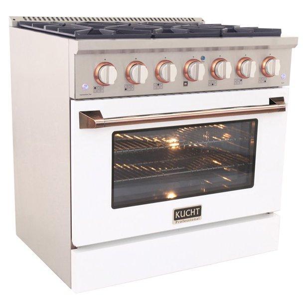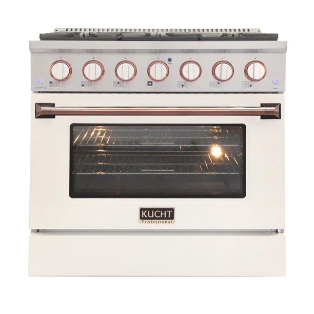 Kucht KDF Series 36" White Custom Freestanding Propane Gas Dual Fuel Range With 6 Burners, White Knobs and Rose Gold Handle