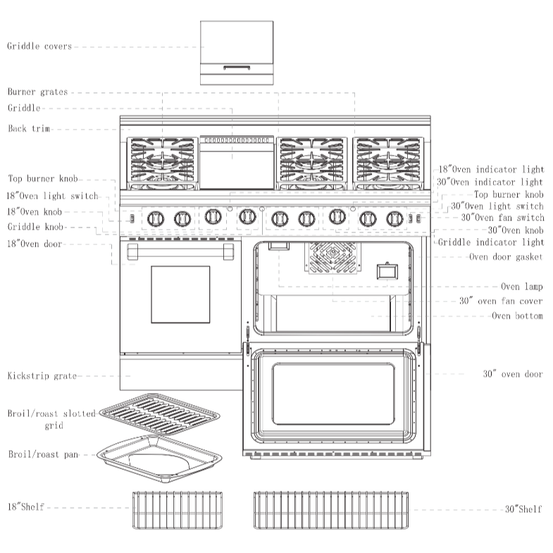 48" Freestanding Dual-Fuel Range. for Extra Large Kitchens! Have a burning desire to have the ultimate large-sized home range and oven? The 48" wide Kucht KRD486F will satisfy even the most demanding home chefs! This professional-class range sports 6 quality stove top burners, and also comes with a high intensity 18,500 BTU griddle. Not only that, but this top of the line model boasts TWO separate ovens – with space enough to prepare a veritable feast – and room to spare. As with all Kucht ranges, the attention to detail coupled with old-world craftsmanship will transform your present home cooking area into a quality kitchen any professional chef would be proud to have in their own restaurants. If cooking is your life’s passion, you can do no better than owning a Kucht!