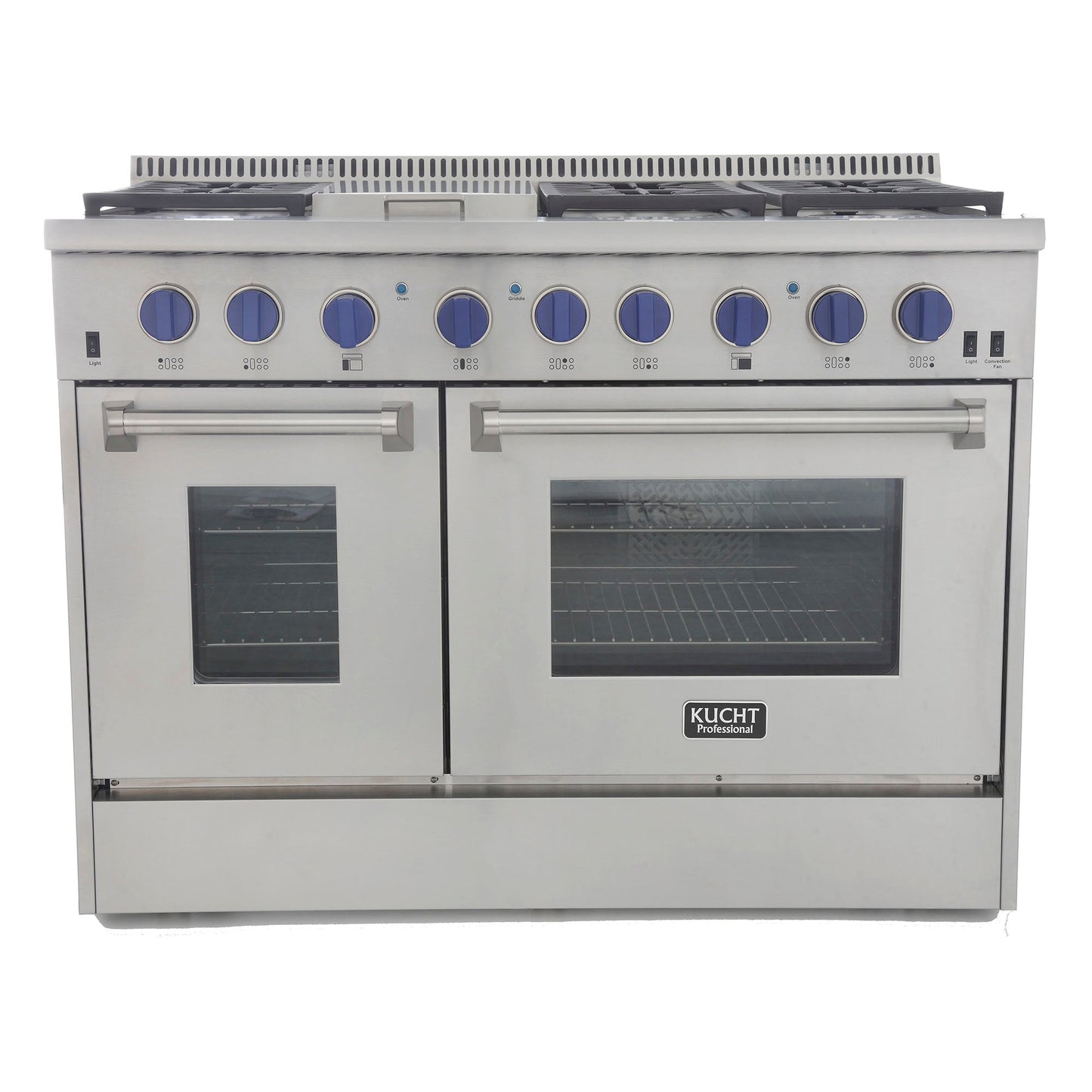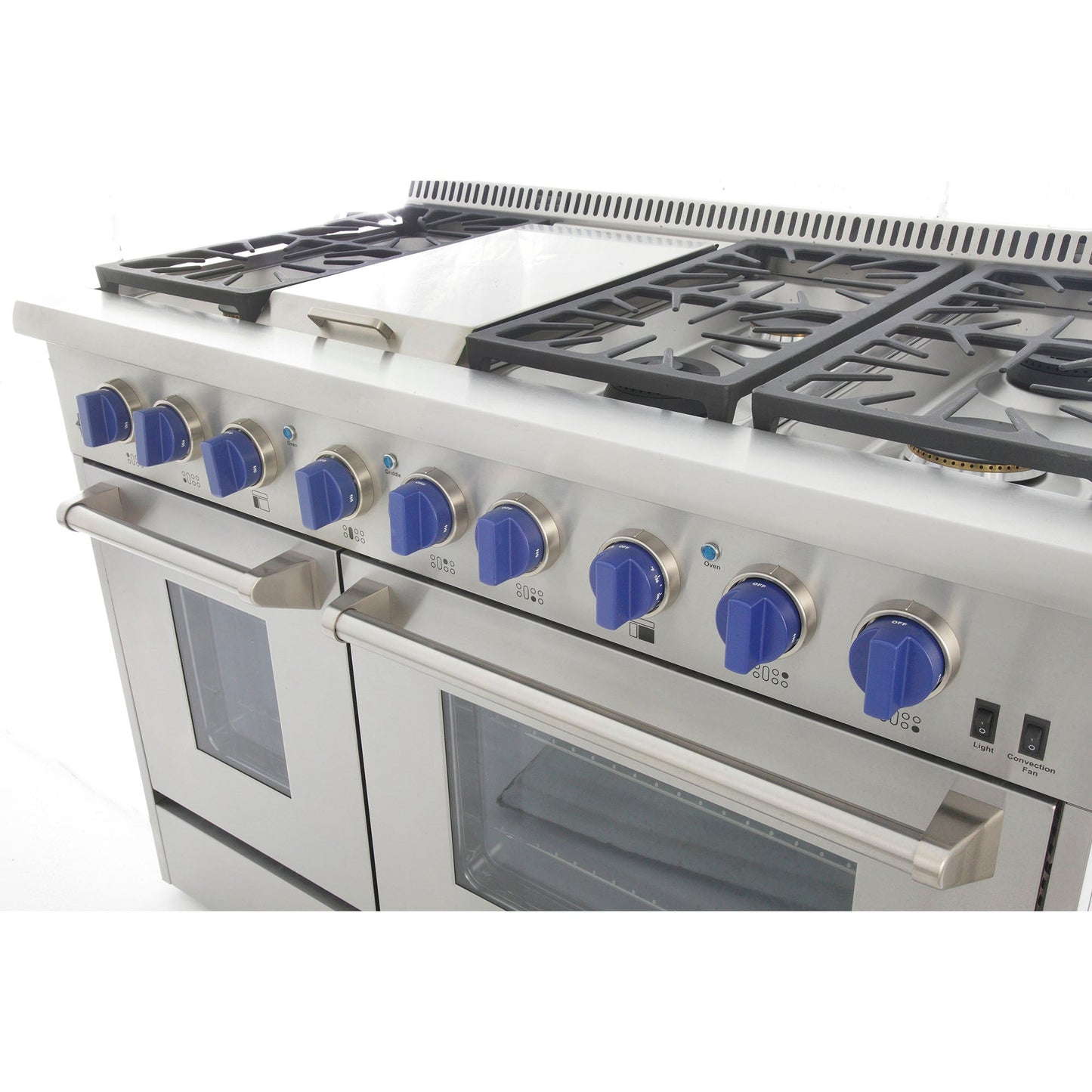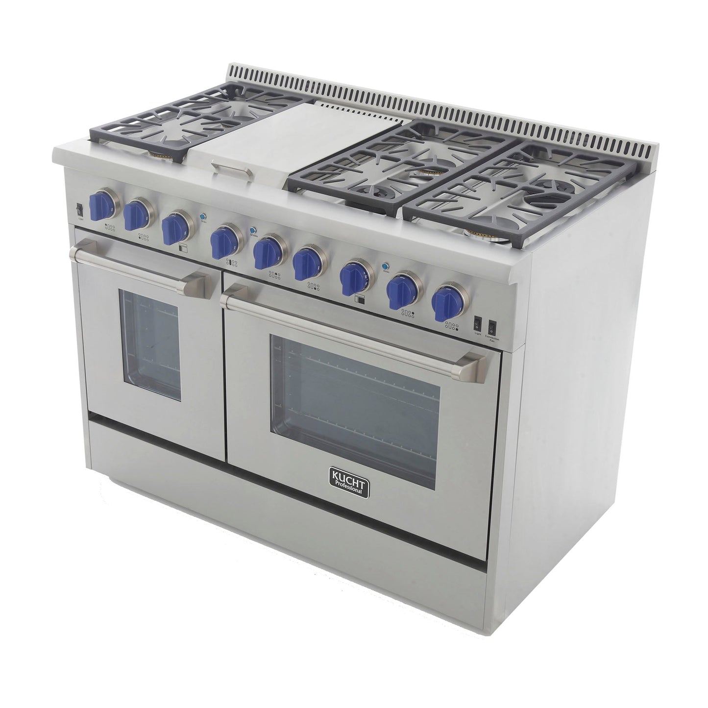 Kucht KRD Series 48" Freestanding Natural Gas Dual Fuel Range With 6 Burners, Griddle and Royal Blue Knobs