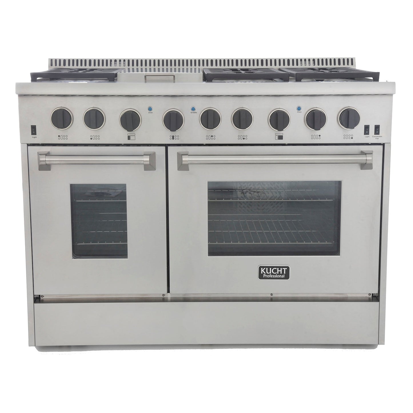 48" Freestanding Dual-Fuel Range. for Extra Large Kitchens! Have a burning desire to have the ultimate large-sized home range and oven? The 48" wide Kucht KRD486F will satisfy even the most demanding home chefs! This professional-class range sports 6 quality stove top burners, and also comes with a high intensity 18,500 BTU griddle. Not only that, but this top of the line model boasts TWO separate ovens – with space enough to prepare a veritable feast – and room to spare. As with all Kucht ranges, the attention to detail coupled with old-world craftsmanship will transform your present home cooking area into a quality kitchen any professional chef would be proud to have in their own restaurants. If cooking is your life’s passion, you can do no better than owning a Kucht!