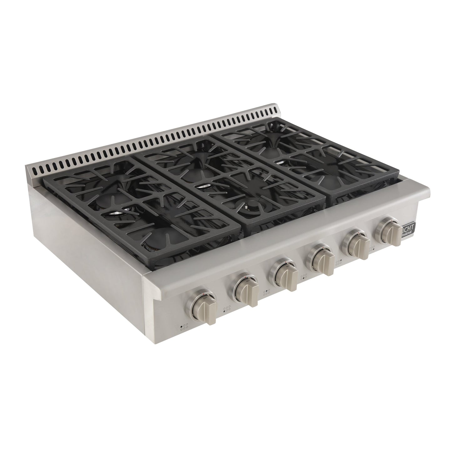 Larger Range Top for Larger Kitchens! Have a larger-sized home kitchen? Then our 36” wide KUCHT KRT361GU may be just perfect for you! This professional grade Range Top boasts 6 individual burners – and now comes with two high-intensity 18,000 BTU burners. Of course, you’ll also find our 15,000 BTU dual flame burner with simmer. As with all KUCHT ranges, it’s the attention to detail coupled with old-world craftsmanship that will turn your average home cooking area into a restaurant-quality kitchen.