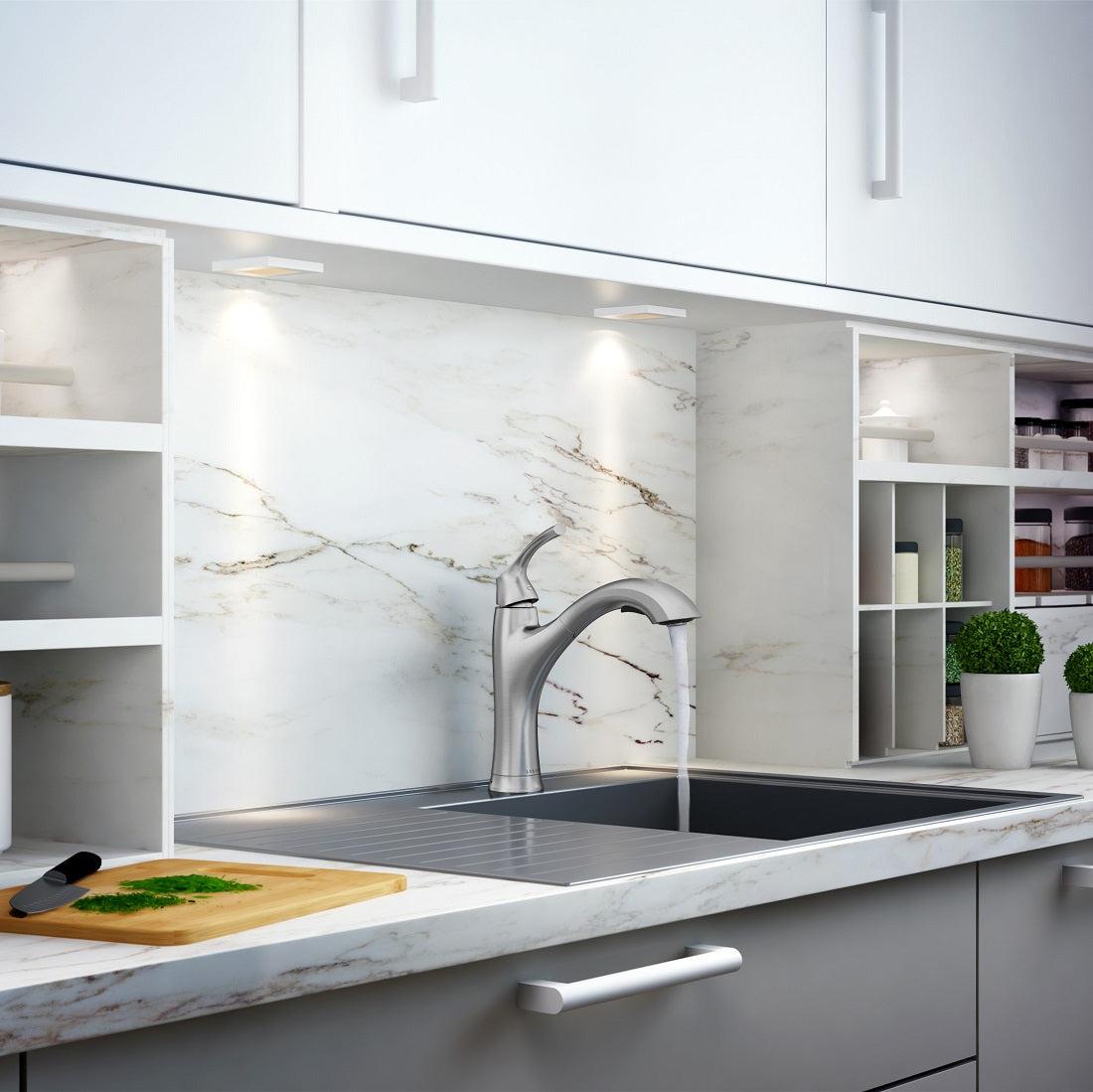 Named after the beautiful islands of the Maldives, this single-handle pull-out kitchen faucet can turn your kitchen into a chef’s paradise. Its smooth, wave-like curves and neutral finishes will complement and lend depth to any contemporary environment.