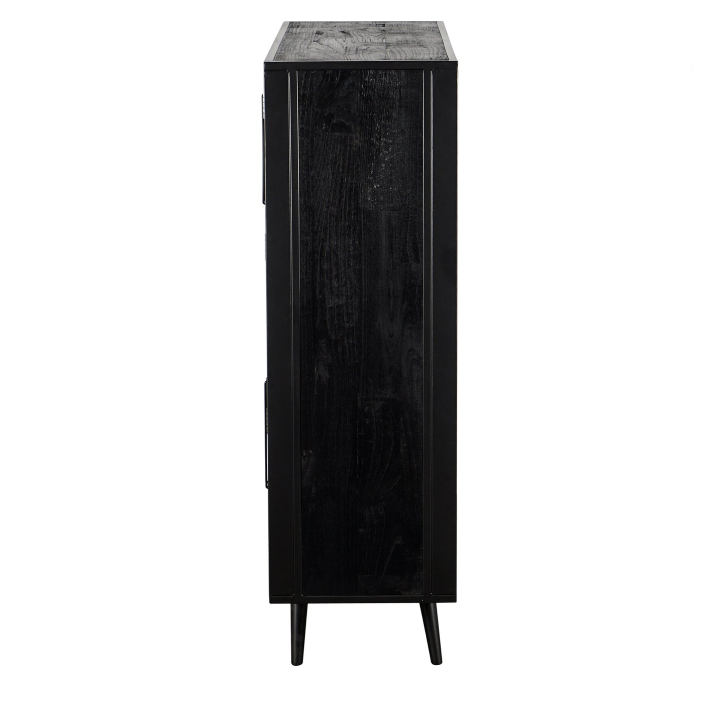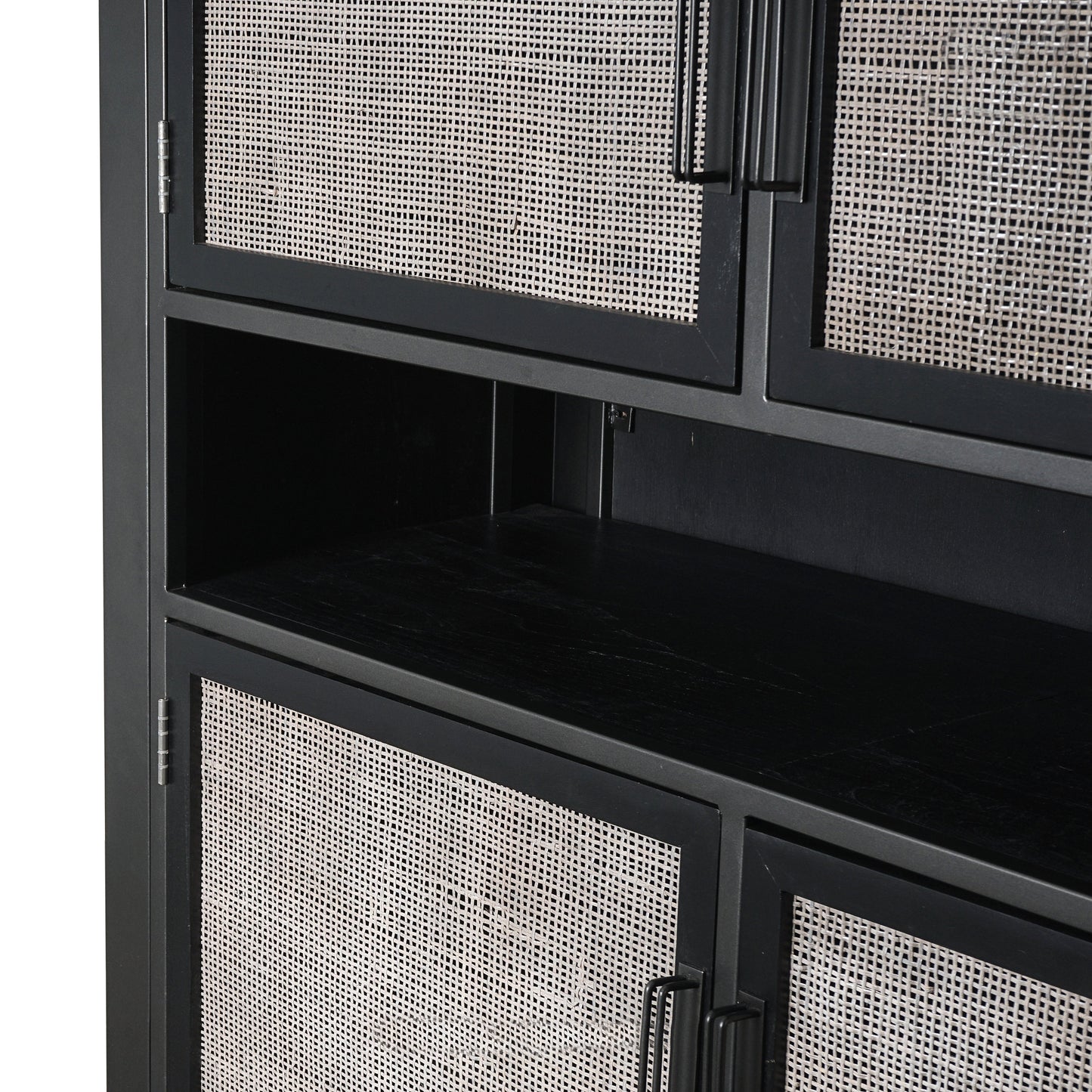 A go-anywhere design. A buffet for storing dinner party essentials. A home office hero for paperwork and colouring crayons. Or even a kitchen staple, like a scaled-down dresser. The two sets of double doors, above and below, paired with the shelf space in between, are what give this piece its true storage potential and versatility. The black water-based paint lightly reveals the rustic texture of the underlying wood. Handwoven split rattan door fronts add a natural and unstructured look to each piece.