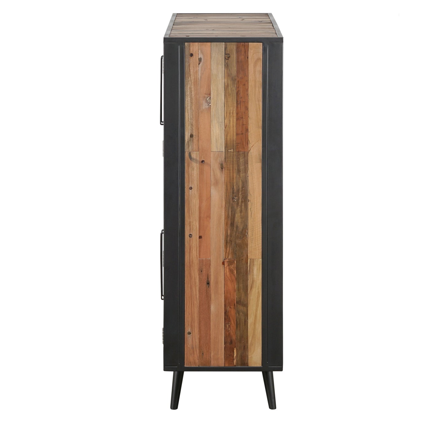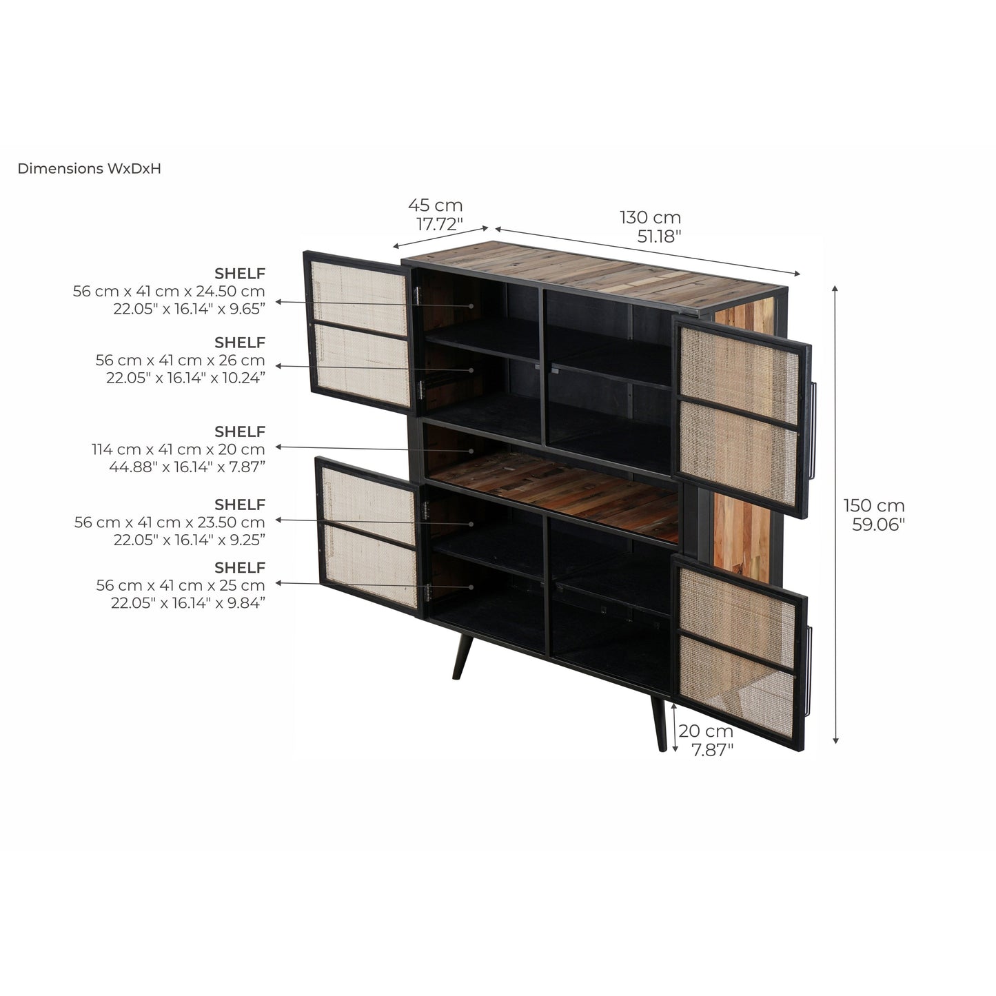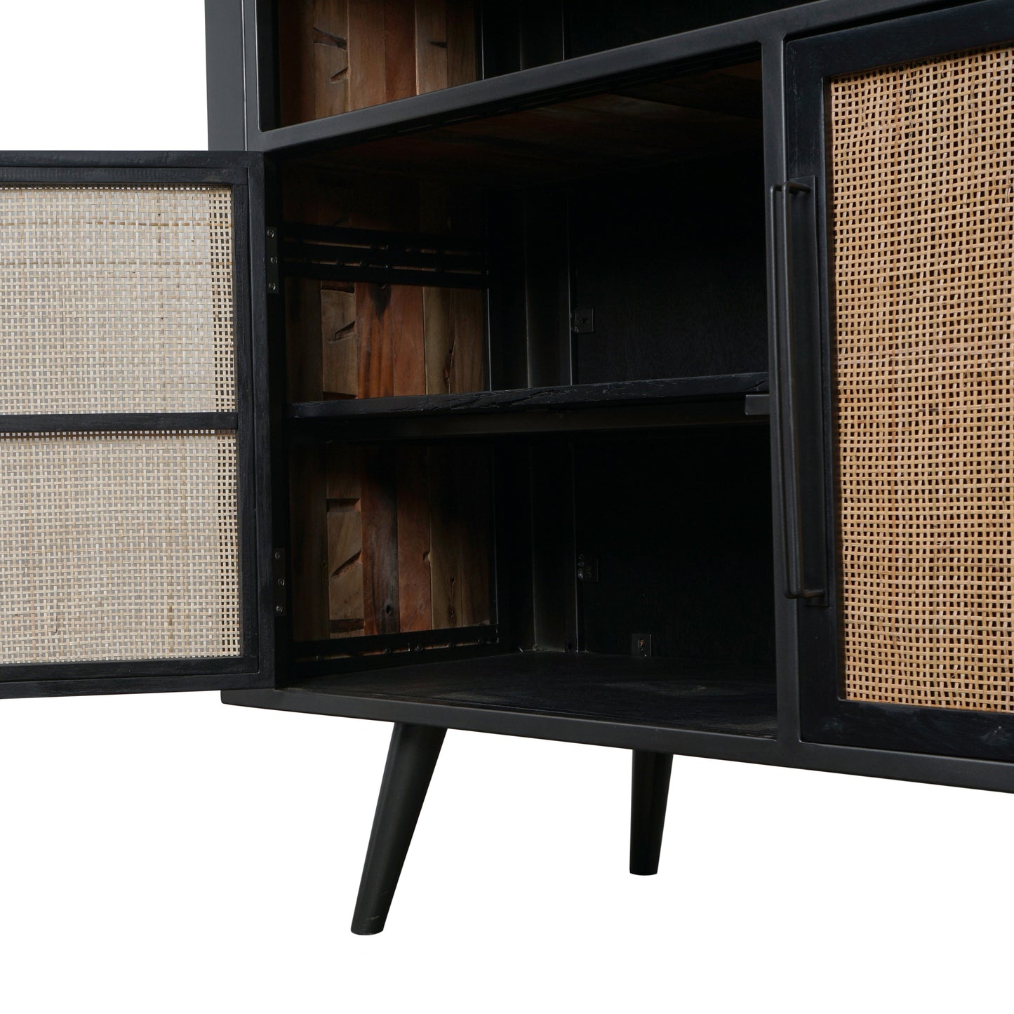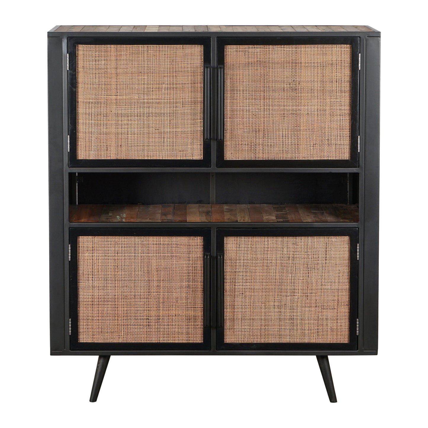 A go-anywhere design. A buffet for storing dinner party essentials. A home office hero for paperwork and coloring crayons. Or even a kitchen staple, like a scaled-down dresser. The two sets of double doors, above and below, paired with the shelf space in between, are what give this piece its true storage potential and versatility. Handmade from solid reclaimed boat wood, featuring retro-inspired iron metal legs and framing, this piece is coated with a natural transparent finish to highlight its character. Handwoven split rattan door fronts add a natural and unstructured look to each piece.