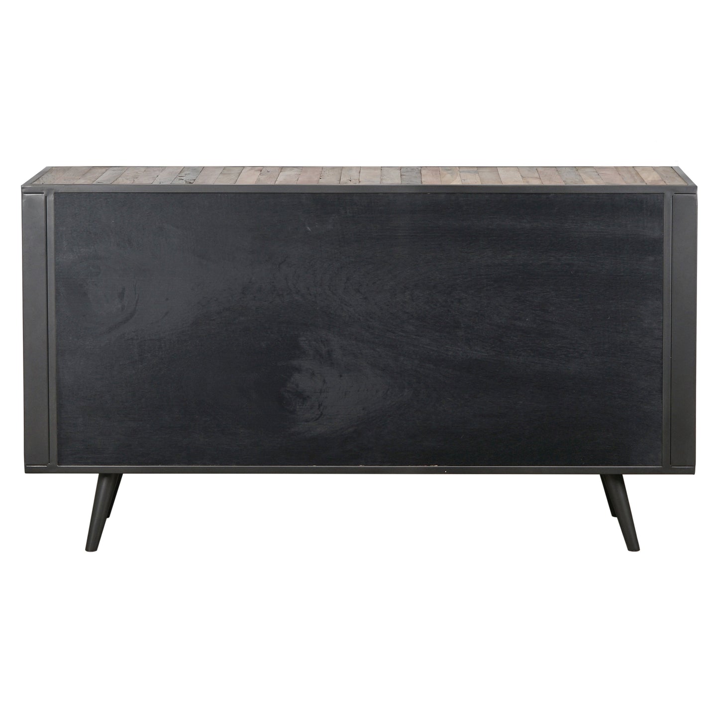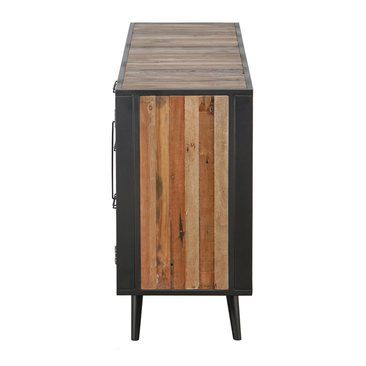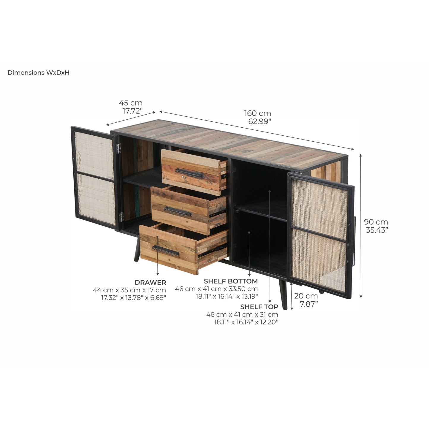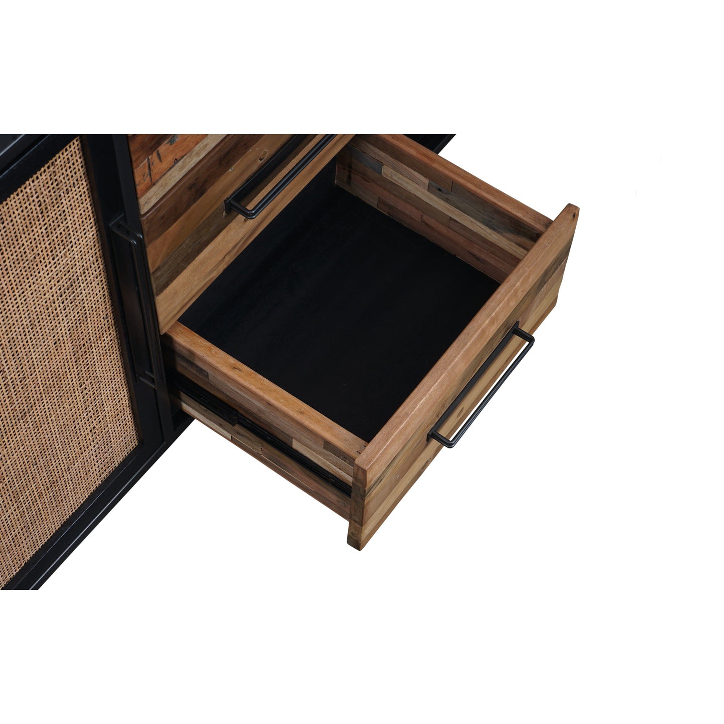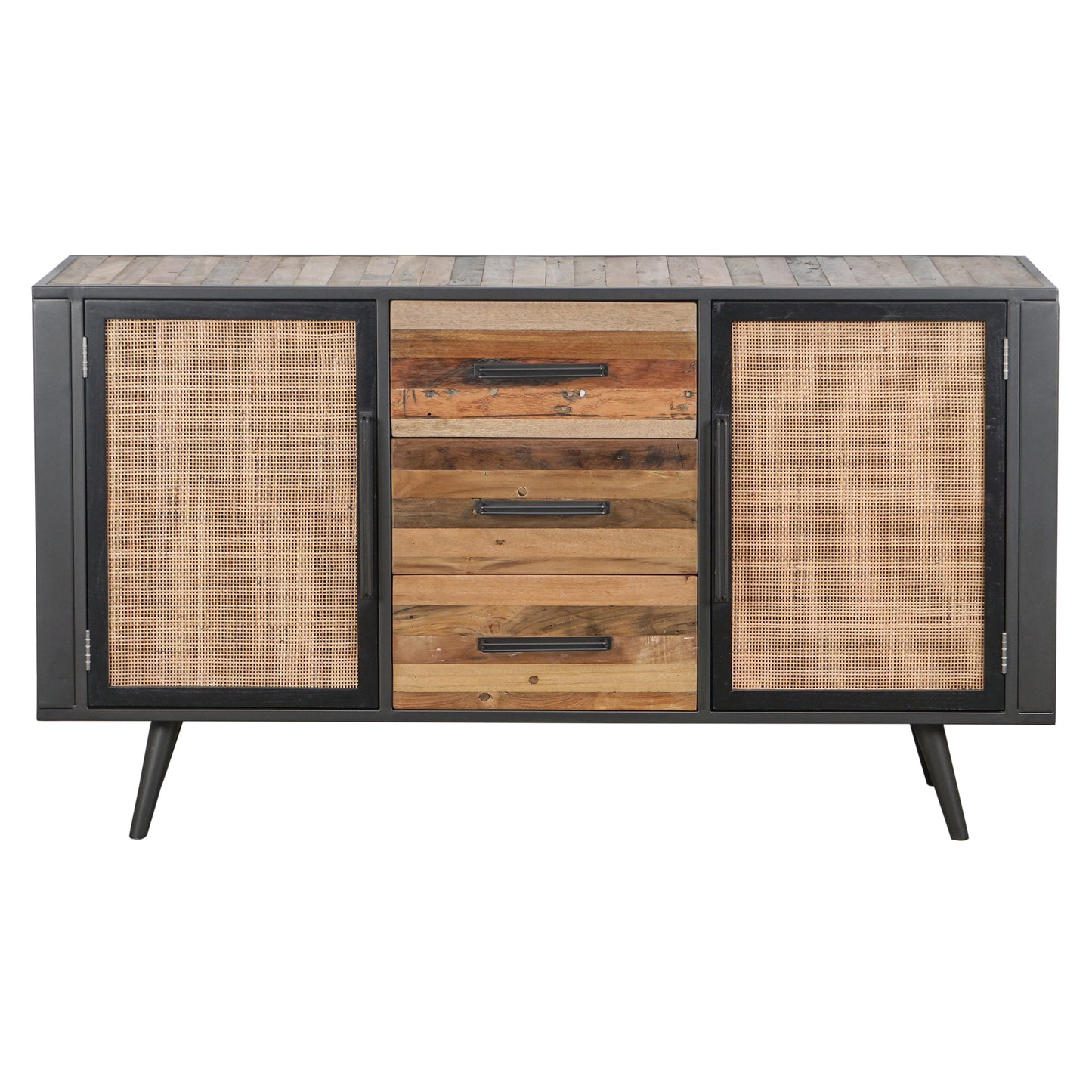 This buffet offers clever storage versatility with its combination of generous drawers and fixed shelving behind two large doors. It's the ideal piece for the living or dining room, housing kitchen utensils or linens in the drawers. Handmade from solid reclaimed boat wood, featuring retro-inspired iron metal legs and framing, this piece is coated with a natural transparent finish to highlight its character. Handwoven split rattan door fronts add a natural and unstructured look to each piece.
