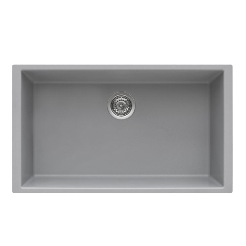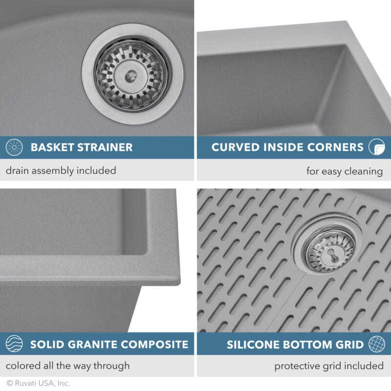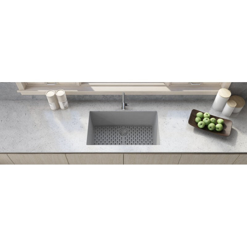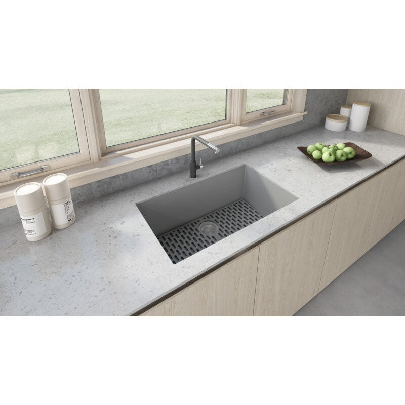 Ruvati epiGranite 33” x 19” Silver Gray Undermount Granite Single Bowl Kitchen Sink With Basket Strainer, Bottom Rinse Grid and Drain Assembly