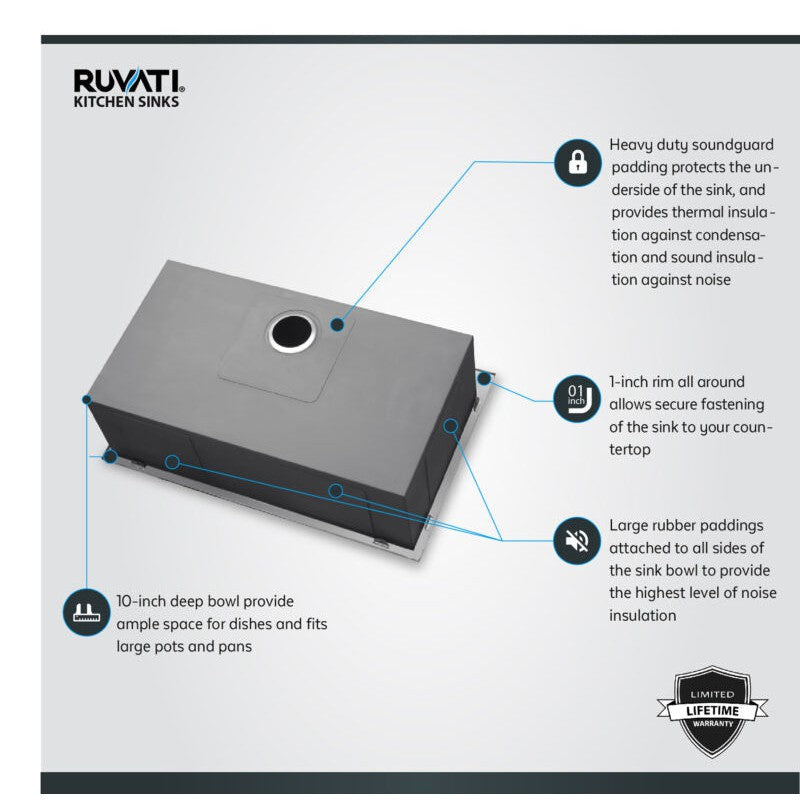 All Ruvati sinks carry a Limited Lifetime Warranty for residential use. Ruvati faucets and accessories are backed by a 1-year limited warranty.