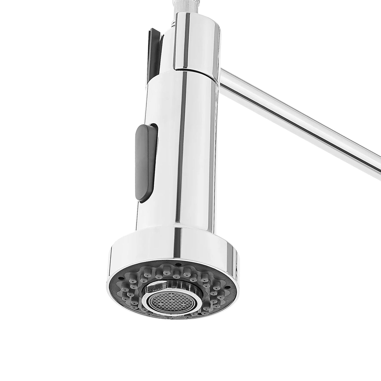 This modern style pull-down kitchen faucet was built with ease of use in mind. With its dual-function pull-out sprayer, this product allows for versatility and can be moved in many different directions. The solid brass construction ensures quality and durability, while being easy to use and install.