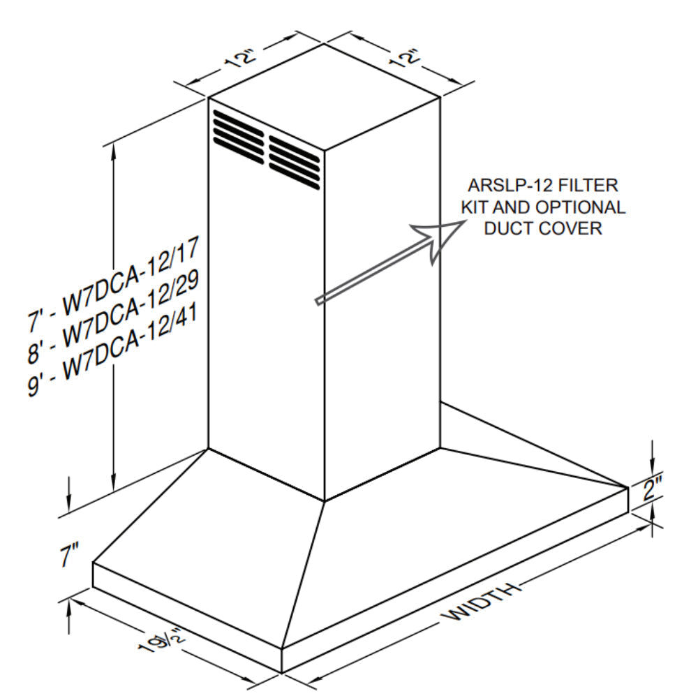 Utilizing a proprietary 4-phase technology and the Power Lung, the Vent-A-Hood ARS series is ideal for light residential cooking where venting is not an option. Linear styling perfectly accents the professional-styled kitchen. Includes the Power Lung K Series Blower. The recommended mounting height is 24" above the cooking surface. Shown with matching ARS duct cover, available in standard sizes for 7', 8', and 9' ceiling heights.