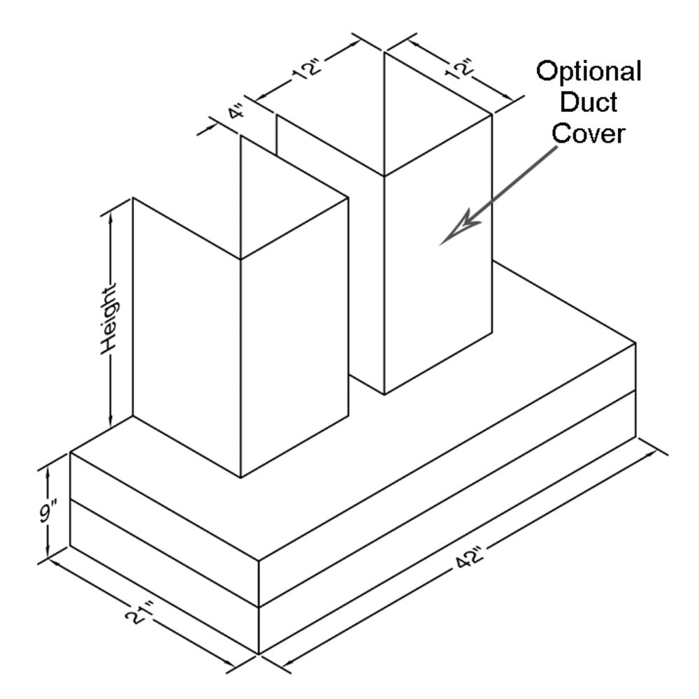 Thick rectangle styling. Recommended mounting height 27" above the cooking surface. Shown with matching wall mount duct covers (sold separately), available in standard sizes for 7', 8', and 9' ceiling heights or in custom sizes. All Vent-A-Hood products are suitable for use in damp locations (outdoor applications such as a covered patio) when installed in a GFCI-protected branch circuit.