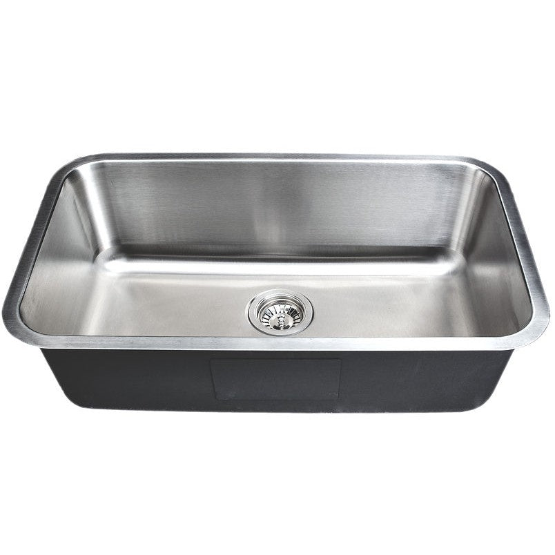 This large single-bowl kitchen sink is made of premium 16-gauge Type 304 stainless steel, the most heavy-duty for residential sinks. It is designed to have tight corners and straight edges with plenty of space to hold pots and pans and everything else. It's easy to move things around in the sink without a divider in place. Measuring 28 inches inside, the sink can be mounted in a 30-inch sink base. The balance of capacity, convenience of use, and fitness for jobs makes it a favorite of many. The sink features a traditional brushed matte finish that allows normal wear and tear to blend into its subtle grains, effectively becoming scratch-resistant. A mirror-highlighted rim adds brightness and sophistication to the sink's minimalist appearance. Heavy-duty rubber pads and coating on underside of each sink bowl muffle the noise of splashing water and absorb condensation due to changes in water temperature. Drain hole is placed toward the rear of the sink so that the under-counter plumbing takes less space and leaves more room for storage. Each Wells stainless steel sink comes with our limited lifetime warranty.