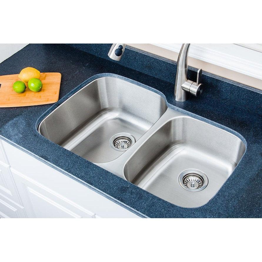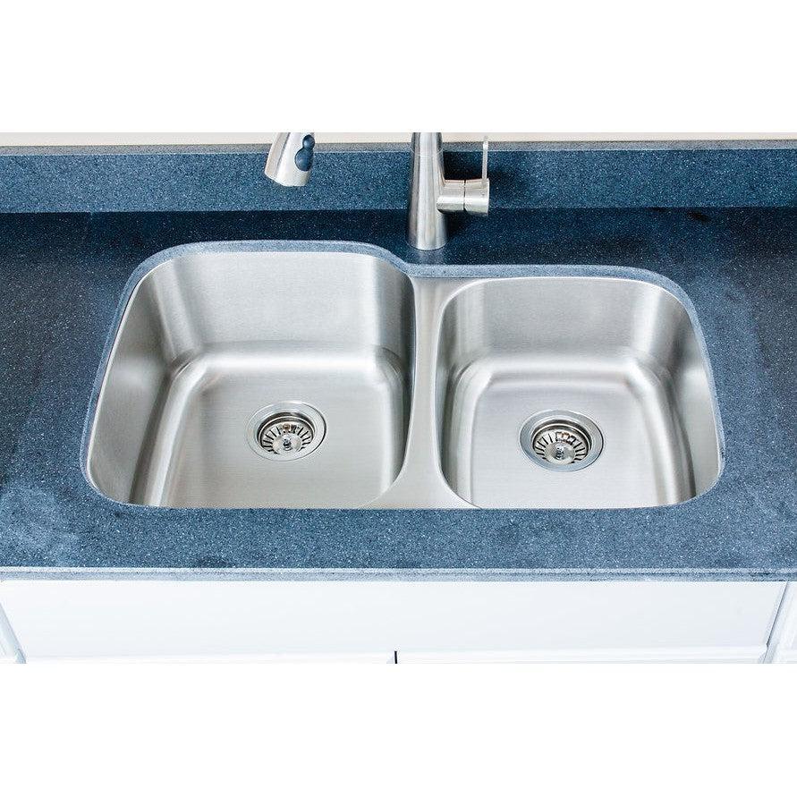 This uneven double-bowl kitchen sink is made of premium 16 gauge Type 304 stainless steel, the most heavy duty for residential sinks. The two bowls are configured in a 60-40 ratio and are 9" and 7" in depth, respectively; its ideal combination of dynamics and usability makes it one of the popular designs on the market. The sink features a traditional brushed matte finish that allows normal wear and tear to blend into its subtle grains, effectively becoming scratch-resistant. A mirror-highlighted rim adds brightness and sophistication to the sink's minimalist appearance. Heavy-duty rubber pads and coating on underside of each sink bowl muffle the noise of splashing water and absorb condensation due to changes in water temperature. Drain holes are placed toward the rear of the sink so that the under-counter plumbing takes less space and leaves more room for storage. Each Wells stainless steel sink comes with our limited lifetime warranty.