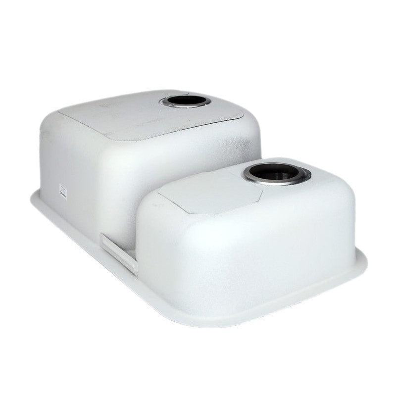 - Undermount double stainless steel bowls 7" and 9" deep configured in 30-70 ratio, with large D-shaped bowl on the right