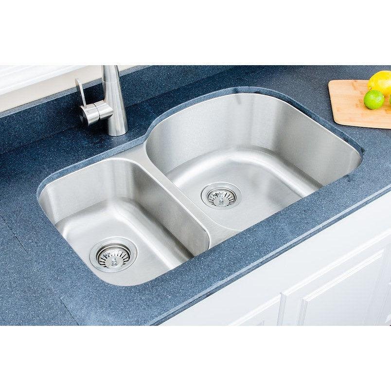 This uneven double-bowl kitchen sink is made of premium 16 gauge Type 304 stainless steel, the most heavy duty for residential sinks. The two bowls are configured in a 30-70 ratio and are 7" and 9" in depth, respectively. The large D-shaped bowl on the right provides ample space for pots and pans, while the small bowl holds lighter items and connects the heavy-lifting garbage disposer if you need to. The combination of its curvy profile and usability makes it a popular choice for kitchen designers. The sink features a traditional brushed matte finish that allows normal wear and tear to blend into its subtle grains, effectively becoming scratch-resistant. A mirror-highlighted rim adds brightness and sophistication to the sink's minimalist appearance. Heavy-duty rubber pads and coating on underside of each sink bowl muffle the noise of splashing water and absorb condensation due to changes in water temperature. Drain holes are placed toward the rear of the sink so that the under-counter plumbing takes less space and leaves more room for storage. Each Wells stainless steel sink comes with our limited lifetime warranty.