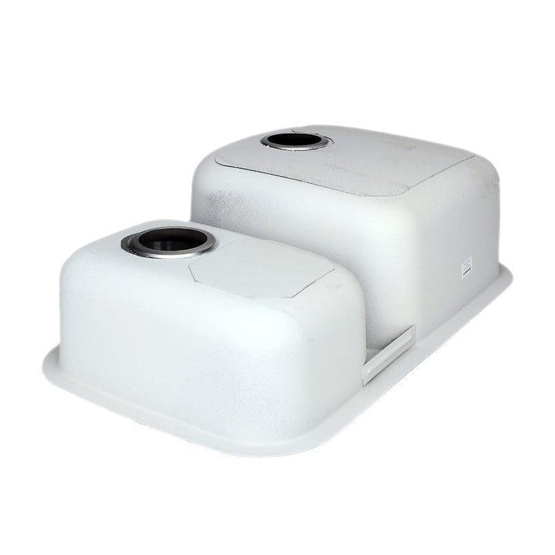 - Undermount double stainless steel bowls 9" and 7" deep configured in 70-30 ratio, with large D-shaped bowl on the left