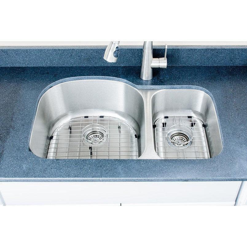 This uneven double-bowl kitchen sink is made of premium 16 gauge Type 304 stainless steel, the most heavy duty for residential sinks. The two bowls are configured in a 70-30 ratio and are 9" and 7" in depth, respectively. The large D-shaped bowl on the left provides ample space for pots and pans, while the small bowl holds lighter items and connects the garbage disposer if you need to. The combination of its curvy profile and usability makes it a popular choice for kitchen designers. The sink features a traditional brushed matte finish that allows normal wear and tear to blend into its subtle grains, effectively becoming scratch-resistant. A mirror-highlighted rim adds brightness and sophistication to the sink's minimalist appearance. Heavy-duty rubber pads and coating on underside of each sink bowl muffle the noise of splashing water and absorb condensation due to changes in water temperature. Drain holes are placed toward the rear of the sink so that the under-counter plumbing takes less space and leaves more room for storage. Each Wells stainless steel sink comes with our limited lifetime warranty.