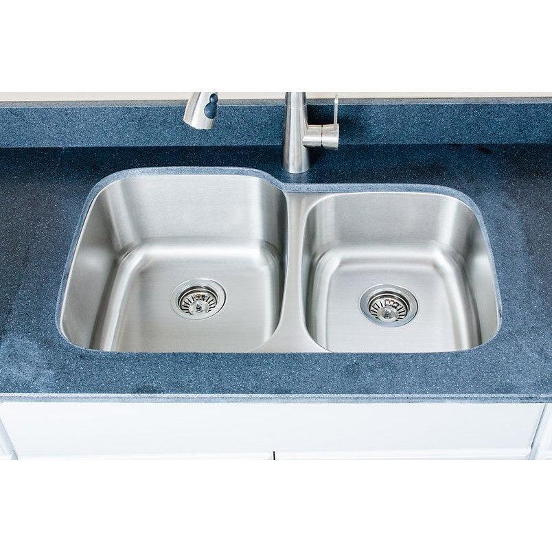 - Undermount double stainless steel bowls 9" and 7" deep configured in 60-40 ratio, with large bowl on the left