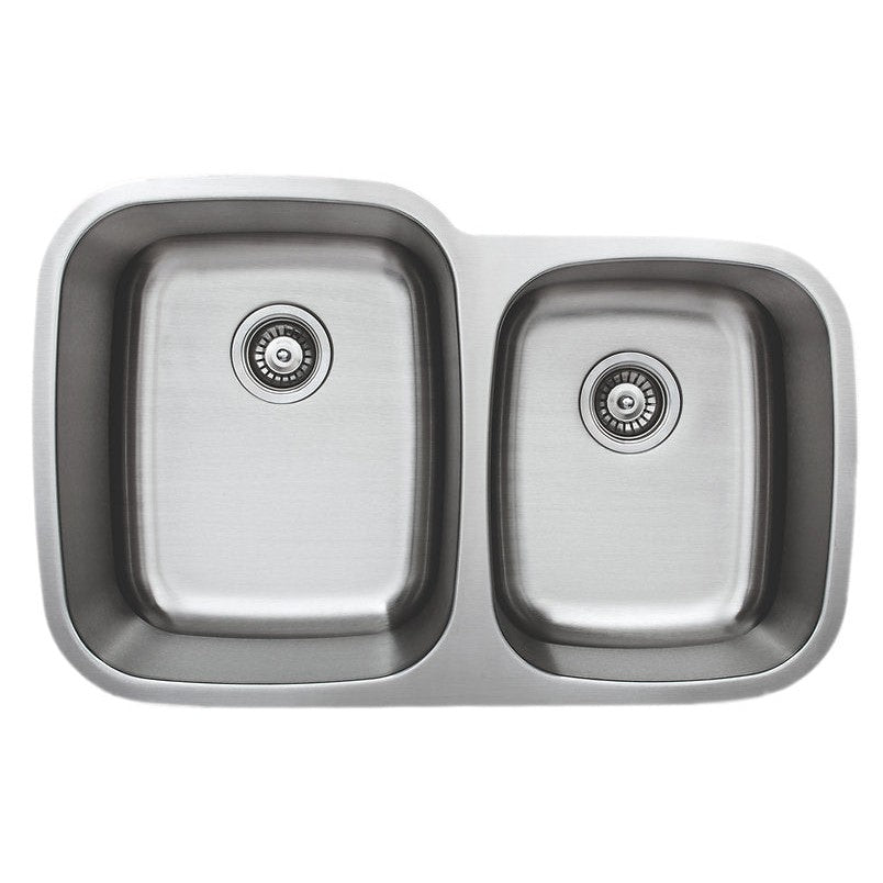 This uneven double-bowl kitchen sink is made of premium 18 gauge Type 304 stainless steel with uncompromised chrome-nickel composition. The two bowls are configured in a 60-40 ratio and are 9" and 7" in depth, respectively; the ideal combination of dynamics and usability makes it one of the popular designs on the market. The sink features a traditional brushed matte finish that allows normal wear and tear to blend into its subtle grains, effectively becoming scratch-resistant. A mirror-highlighted rim adds brightness and sophistication to the sink's minimalist appearance. Heavy-duty rubber pads and coating on the underside of each sink bowl deaden the noise of splashing water and absorb condensation due to changes in water temperature. Drain holes are placed toward the rear of the sink so that the under-counter plumbing takes less space and leaves more room for storage. Each Wells stainless steel sink comes with our limited lifetime warranty.