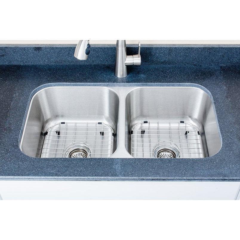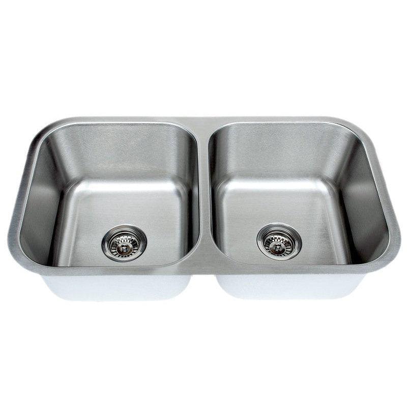 This even double-bowl kitchen sink is made of premium 16 gauge Type 304 stainless steel, the most heavy-duty for residential sinks. The classic symmetric design makes it one of the most popular choices by designers and homeowners. The sink features a traditional brushed matte finish that allows normal wear and tear to blend into its subtle grains, effectively becoming scratch-resistant. A mirror-highlighted rim adds brightness and sophistication to the sink's minimalist appearance. Heavy-duty rubber pads and coating on underside of each sink bowl muffle the noise of splashing water and absorb condensation due to changes in water temperature. Each Wells stainless steel sink comes with our limited lifetime warranty.