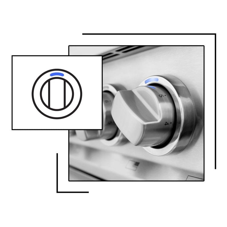 LED INDICATORS Blue LED illuminated knobs indicate when the range is in use for added convenience and safety. |